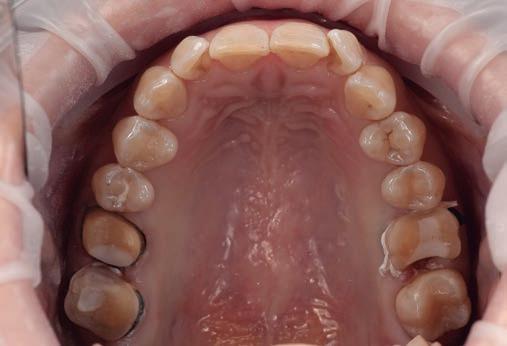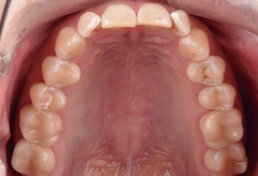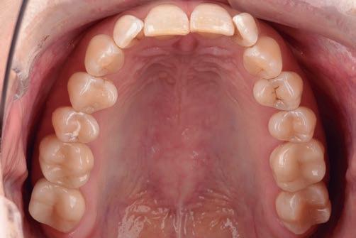 con EFFECT STAINS 01 (blanco) y se imitaron calcificaciones localizadas mediante EFFECT STAINS 02 (crema). Por último, se obtuvo un grado de brillo uniforme mediante VITA AKZENT Plus GLAZE LT. El pulido de alto brillo se llevó a cabo con la pasta de pulido de diamante VITA Polish Cera, disco de cuero y cepillo de pelo de cabra. Durante la colocación completamente adhesiva se constató un ajuste preciso de las restauraciones de cerámica de feldespato, que gracias a su pronunciado efecto camaleón y al efecto cromático natural armonizaban estéticamente con la sustancia dental dura.