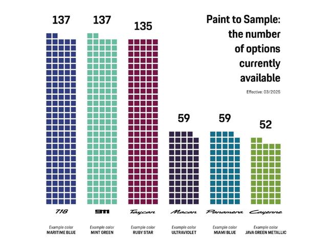 A ampla gama varia consoante o modelo e o local de produção. Existem mais de 130 cores à escolha para os modelos 718, 911 e Taycan. Para o Panamera, Macan, e Cayenne, existem mais de 50 opções de cores. As cores da gama Paint to Sample podem ser encomendadas no configurador de automóveis novos. O prazo de entrega, se existir quota de produção, é cerca de três meses superior ao padrão.