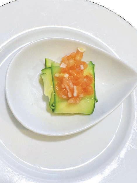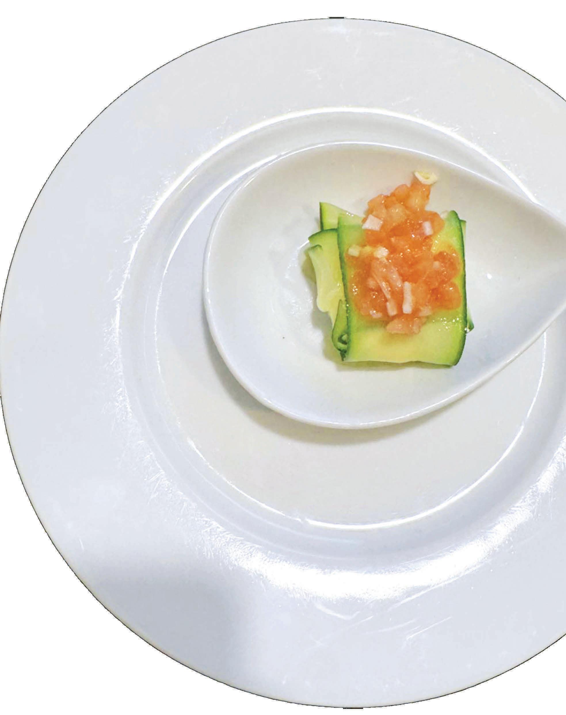 • Para montar el plato, colocamos dos láminas de calabacín en forma de cruz. En el centro añadimos una pequeña cucharada de mahonesa de wasabi y encima los dados de venado. Cerramos las láminas formando pequeños saquitos.