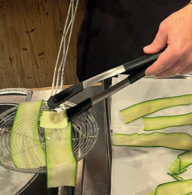 • Mientras tanto, laminamos los calabacines a lo largo en láminas finas y los escaldamos en agua hirviendo con sal durante aproximadamente dos minutos. Después los enfriamos rápidamente y reservamos.