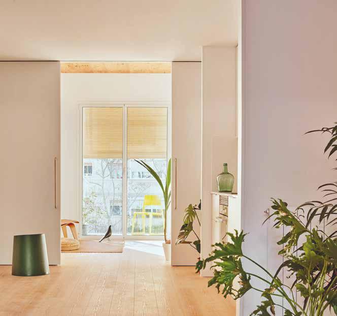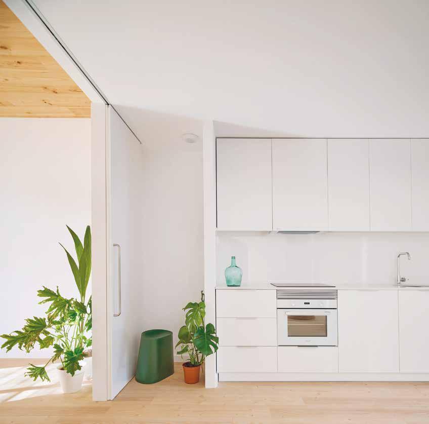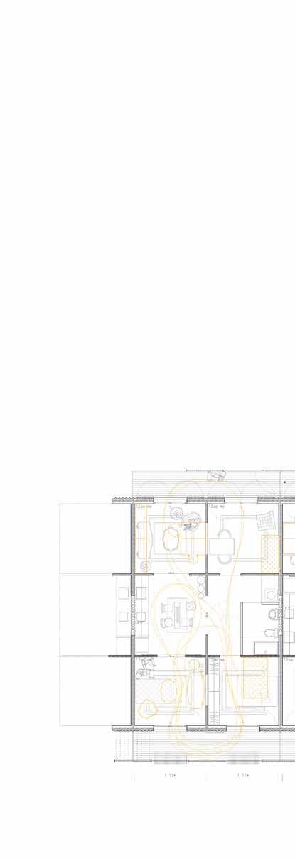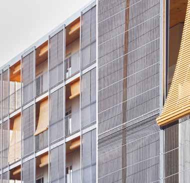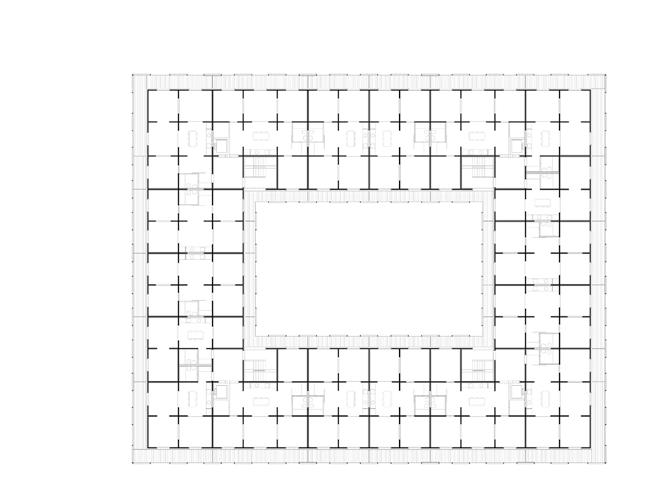 Valores básicos de la arquitectura y el urbanismo: El diseño de una matriz de habitaciones comunicantes y el uso de la madera en favor de la mejora de la calidad de la construcción son los ejes de este nuevo edificio de viviendas. El edificio distribuido alrededor de un patio se organiza en 114 espacios por planta, de dimensiones semejantes, que eliminan pasillos tanto privados como comunitarios para obtener el máximo aprovechamiento de la planta. Las viviendas constan entre cinco, seis o siete módulos. La cocina abierta e inclusiva se sitúa en la habitación central, actuando como pieza distribuidora que sustituye a los pasillos, a la vez que permite visibilizar el trabajo doméstico y evitar roles de género. El resto de habitaciones de uso y tamaño indiferenciado, de unos 13 m², discurren en fachada ofreciendo distintos modos de habitar. Otra terraza en la corona exterior completa la secuencia espacial, el enfilade de espacios interconectados por grandes aberturas, permeables al aire, la mirada y el paso.