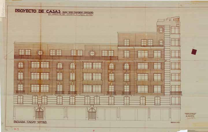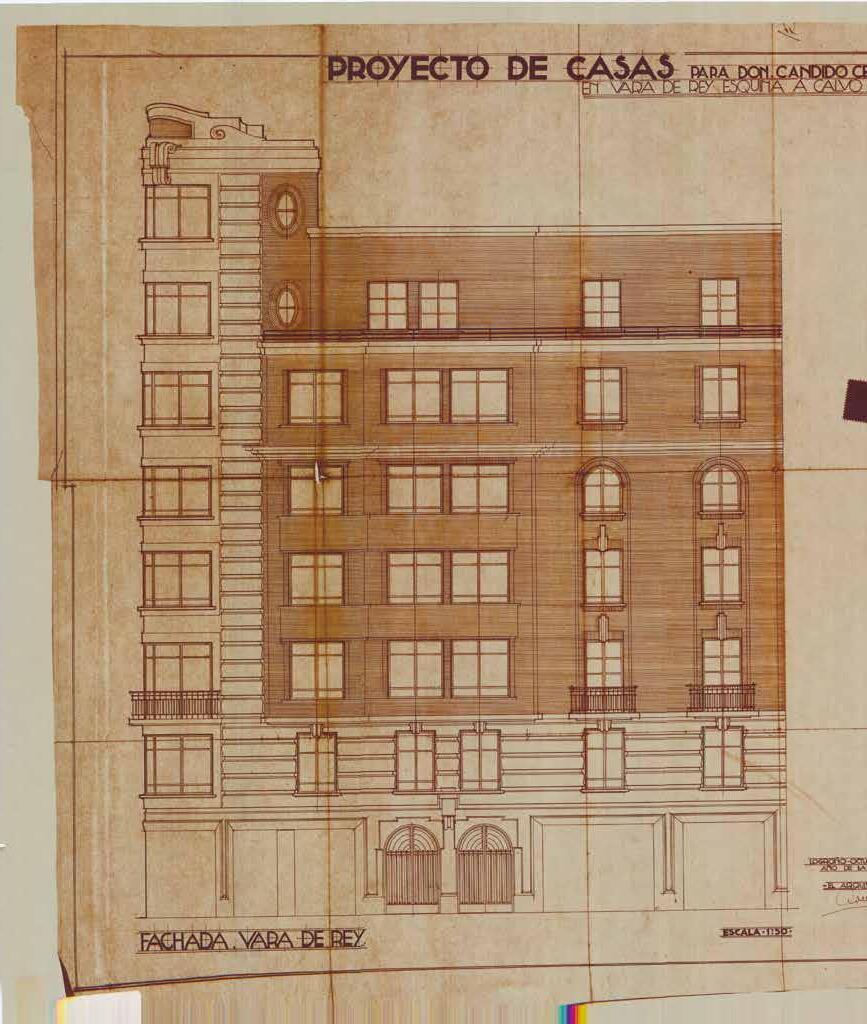 Alzados de bloque de viviendas, fachadas a Calvo Sotelo y Vara de Rey.