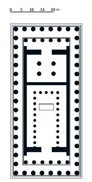 Las dimensiones del edificio, levantado sobre tres gradas, son 69,5 metros de longitud por 30,9 metros de anchura, con columnas que alcanzan 10,4 metros de altura. Estas dimensiones permitieron crear dos grandes salas: una al Este, que albergaba una estatua de doce metros de altura y otra al Oeste. La proporción largo–ancho y ancho–alto es de 9/4.