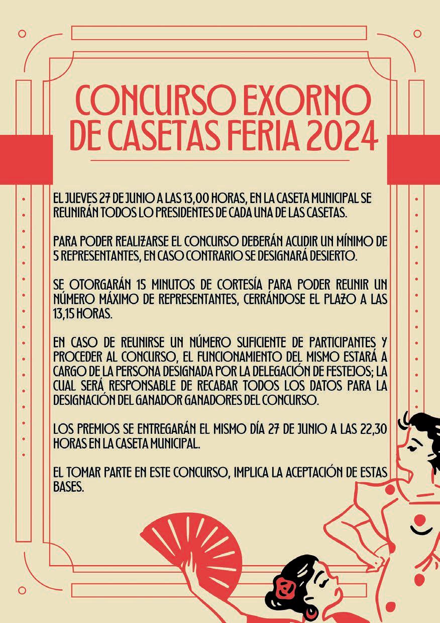 22:30 h. Entrega de placas a Abuelo y Abuela 2024, premios de exorno a las Casetas, premios Desfile-Concurso de trajes de flamenca y premio al Cartel de Feria.