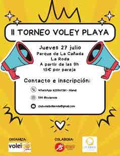 Y dado el éxito de los nuevos campos de vóley playa del parque de la cañada este año volvemos a realizar el torneo local de vóley playa y el torneo de verano de 4x4 pista, además de poner en marcha el I curso de vóley playa en el mes de julio para todos los jóvenes de la localidad.