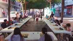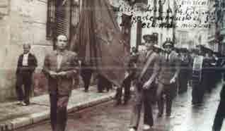 Y colgaron de un cordel en la Miliaria un cartel, y banderas de papel verdes, rojas y amarillas.