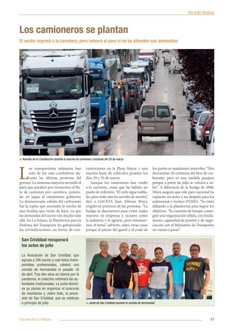 os transportistas solaneros han sido de los más combativos durante las últimas protestas del gremio. La inmensa mayoría secundó el paro que paralizó por momentos el flujo de camiones por carretera, poniendo en jaque al mismísimo gobierno. La desmesurada subida del carburante fue la espita que encendió la mecha de una bomba que venía de lejos, ya que las demandas del sector van mucho más allá. En La Solana, la Plataforma para la Defensa del Transporte ha galvanizado las reivindicaciones, en forma de con-