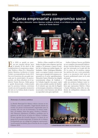 Homenaje a la música andaluza La Banda Municipal de Música volvió a lucirse en los Galanes, como de costumbre. Ángel Sancho diseño un recital con piezas exclusivamente orquestadas para la ocasión, esta vez con un homenaje a la música andaluza. Al-Andalus, Entre dos aguas, Orobroy y Palindromía Flamenca deleitaron al público, ayudados por la guitarra de Juli García, el piano de Alfonso Candelas, el saxo soprano de Lourdes Moreno y la danza de un grupo de la escuela municipal. El himno de La Solana, acompañado por un collage de imágenes representativas de nuestra localidad, puso el broche de oro a la gala Galanes-2019.