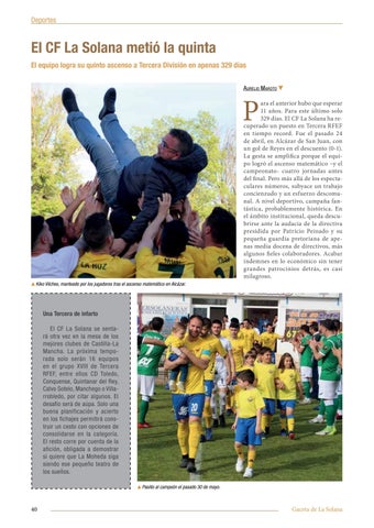 ara el anterior hubo que esperar 11 años. Para este último solo 329 días. El CF La Solana ha recuperado un puesto en Tercera RFEF en tiempo record. Fue el pasado 24 de abril, en Alcázar de San Juan, con un gol de Reyes en el descuento (0-1). La gesta se amplifica porque el equipo logró el ascenso matemático –y el campeonato- cuatro jornadas antes del final. Pero más allá de los espectaculares números, subyace un trabajo concienzudo y un esfuerzo descomunal. A nivel deportivo, campaña fantástica, probablemente histórica. En el ámbito institucional, queda descubrirse ante la audacia de la directiva presidida por Patricio Peinado y su pequeña guardia pretoriana de apenas media docena de directivos, más algunos fieles colaboradores. Acabar indemnes en lo económico sin tener grandes patrocinios detrás, es casi milagroso.