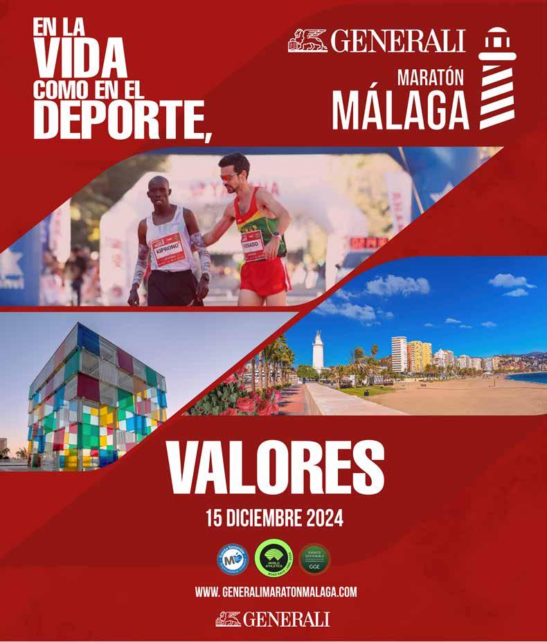 valores que conlleva, como son el esfuerzo, la superación, la motivación, el respeto y el compañerismo. Esto último se ve reflejado a través de grandes gestos deportivos, como el que presenciamos el año pasado del español Ricardo Rosado con el keniano Evans Kimptai en la llegada a meta. Por todo esto cobra mucho valor el Generali Maratón de Málaga.