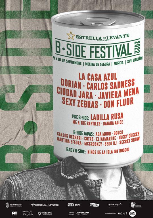 A partir de las 19:30 B-SIDE FESTIVAL 2022. Concierto de LA CASA AZUL, DORIAN, CARLOS SADNESS, CIUDAD JARA, JAVIERA MENA, SEXY ZEBRAS Y DON FLUOR. Lugar del concierto en el nuevo recinto de eventos de Molina de Segura (REMO) sito en la C/ Piña. Entradas a la venta Www.b-sidees/event/b-side-festival-2022https://entradas.crashmusic.en: