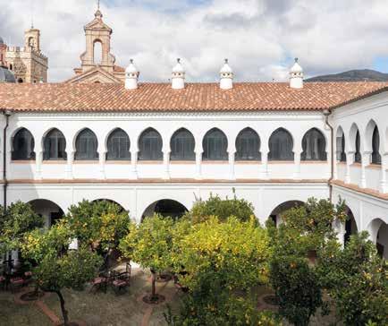 It is located in what was once the palace of the Dukes of Feria, a clear sign of its long and rich history, which includes the Extremaduran conquistador Hernán Cortés, a guest of the palace. The building was originally a fortress, later becoming the dukes' palatial residence. Its spectacular façade gives way to a refined interior with nine original towers crowned with battlements. The Parador preserves beautiful coffered ceilings, chests, ironwork, railings, and decorative elements of the old palace. The beautiful interior courtyard and the spectacular views of the city from the terrace stand out. The hotel also offers a selection of spacious and stately rooms, an outdoor swimming pool, and a welltended garden. The restaurant offers authentic food from Badajoz, based on the pastures of Extremadura, and wild products from the countryside. Its menu worships the Iberian pig without neglecting the cheeses or specialties of pastoral heritage, such as migas (fried breadcrumbs) or lamb stew.
