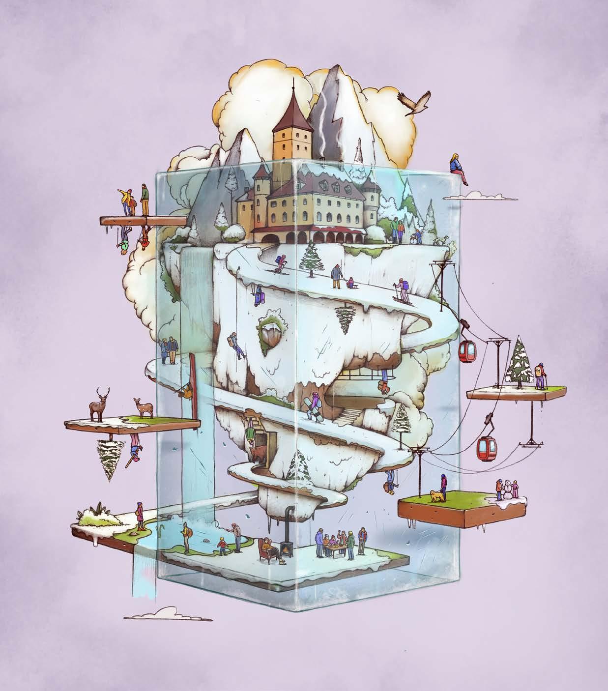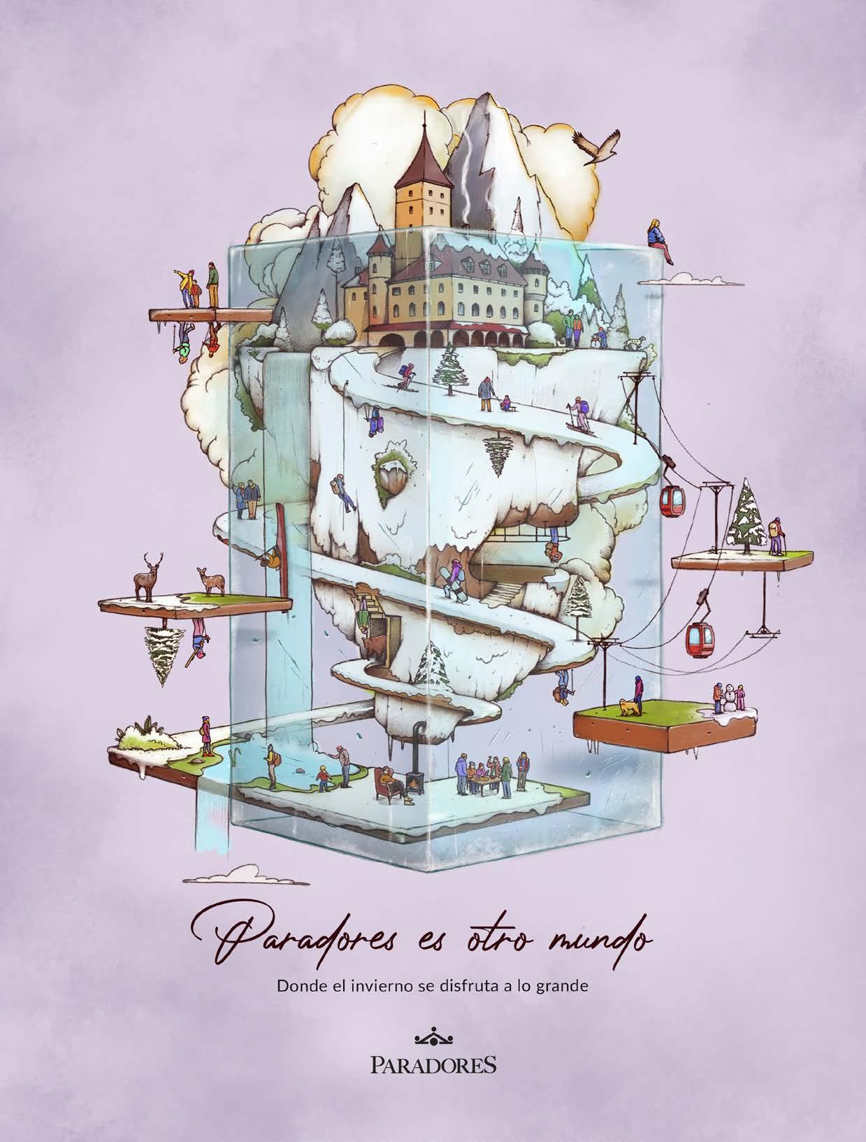El artista Oscar Llorens trae de nuevo a Paradores una ilustración fantástica, “de otro mundo”. La imagen de un invierno que le recuerda a su relación con la sierra de Gredos, donde regresa cuando llega el frío. “Cuando viajo en invierno a mi pueblo, que está muy cerca del Parador de Gredos, tengo la sensación de entrar en otro mundo. Eso es lo que he querido transmitir en esta ilustración”, explica el artista. En esta imagen se plantea el Parador como un refugio en plena montaña, rodeado de nieve, caminos y pequeñas escenas de vida invernal que transmiten esa calma, ese ritmo distinto y esa conexión con la naturaleza que se vive en Gredos durante los meses más fríos como si se tratase de otro mundo.