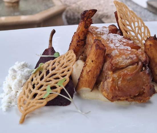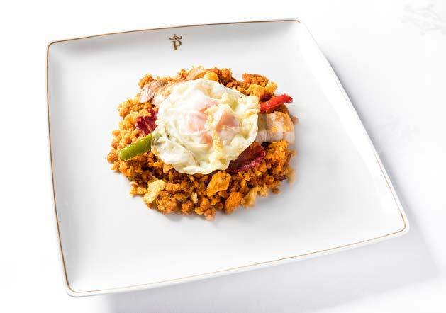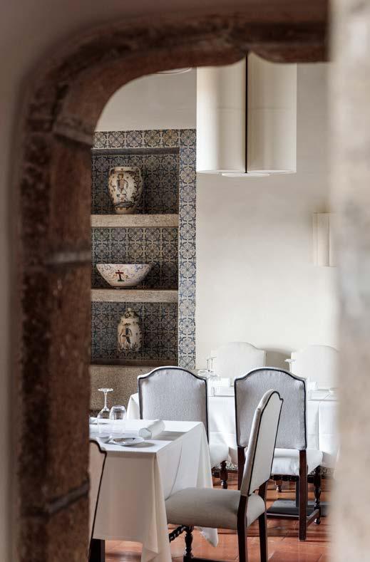 In the restaurant, traditional Extremaduran cuisine is clearly expressed: acorn-fed ham from the Dehesa de Extremadura, Iberian cured meats and cheeses from the region; and, as specialities, shoulder of kid, patatas revolconas (mashed potatoes with bacon) and repápalos (fried potatoes) with aniseed and cinnamon. The flavours that define the region also appear on the table – with La Vera paprika as an essential accent – in dishes such as Extremaduran migas or tomato soup.