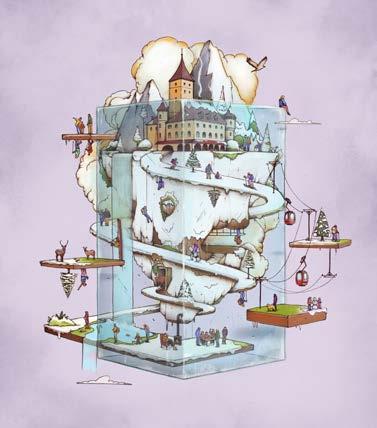 Artist Oscar Llorens brings another fantastic, “otherworldly” illustration to Paradores. The image of winter reminds him of his connection to the Sierra de Gredos mountains, where he returns when the cold weather arrives. “When I travel to my village in winter, which is very close to the Parador de Gredos, I feel like I’m entering another world. That’s what I wanted to convey in this illustration,” explains the artist. In this image, the Parador is presented as a refuge in the middle of the mountains, surrounded by snow, paths and small scenes of winter life that convey the calm, the different pace and the connection with nature that is experienced in Gredos during the colder months, as if it were another world.