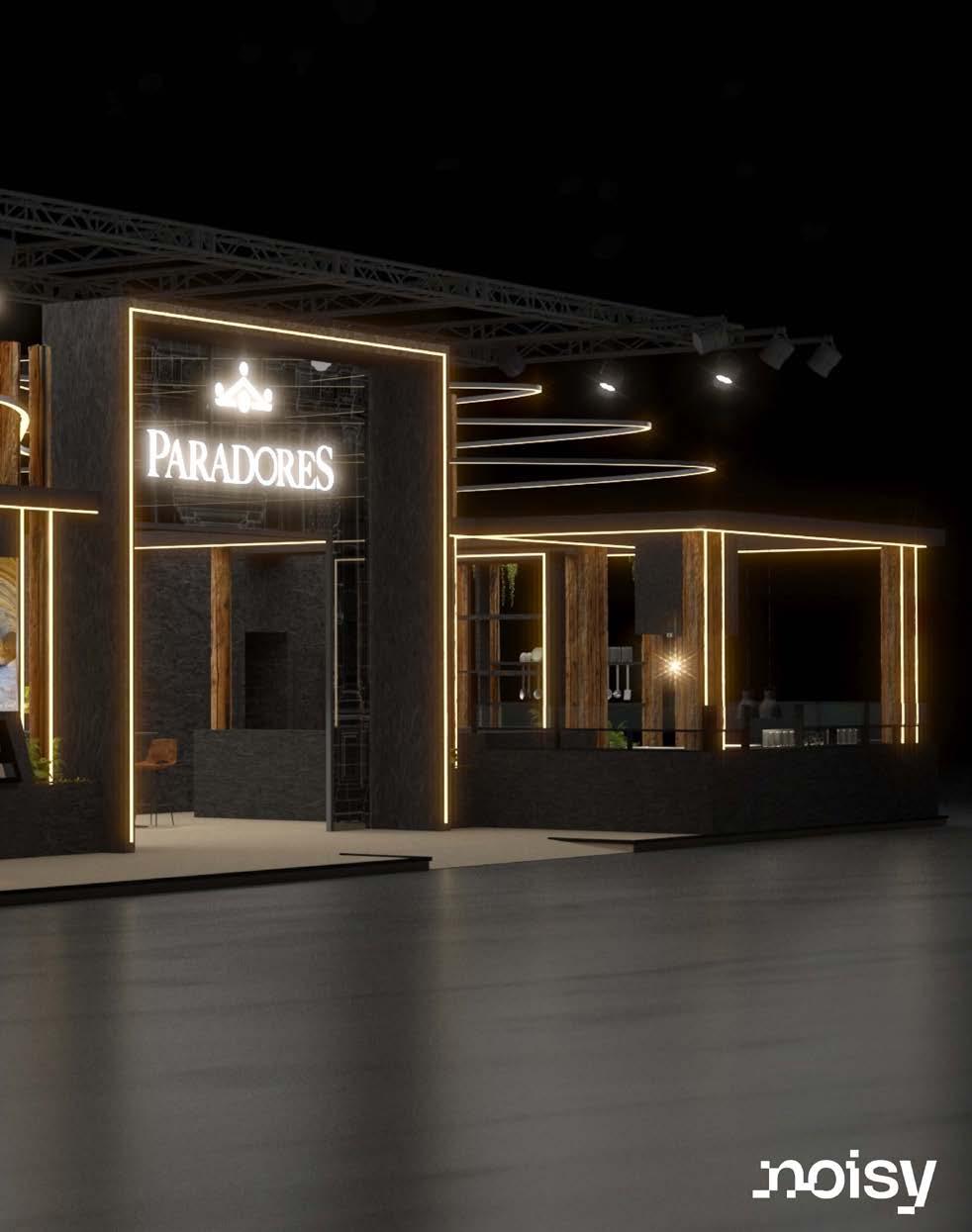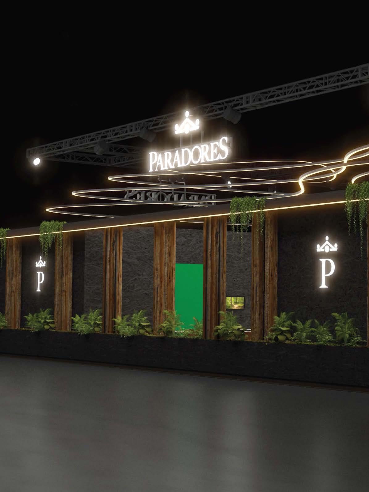La inspiración principal de este año es el Parador de Santo Estevo, situado en pleno corazón de los bosques de la Ribeira Sacra. Antiguo monasterio benedictino y monumento artístico e histórico, Santo Estevo desprende un encanto especial, marcado por la espiritualidad, la leyenda y su privilegiada ubicación entre castaños y robles. Sus claustros de estilo románico, gótico y renacentista se reinterpretan en el diseño del stand mediante columnas dobles y sus capiteles se transforman en troncos que se elevan como el bosque que lo protege, mientras que las cúpulas y bóvedas nervadas se convierten en elementos de luz que recorren el espacio y envuelven al visitante.