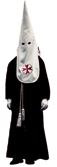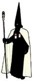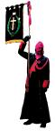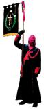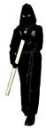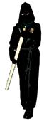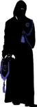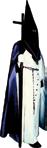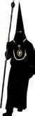 Pantalones, calcetines, zapatos, corbata y guantes de color negro y la camisa blanca. Se ciñe la túnica a la cintura con un cíngulo de seda y oro