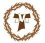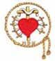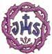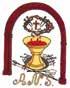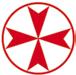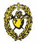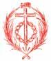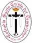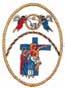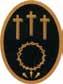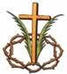 Cruz latina de color oro y dos palmas, una a cada lado de color verde. Todo ello rodeado con una corona de espinas en perspectiva de ocho huecos.