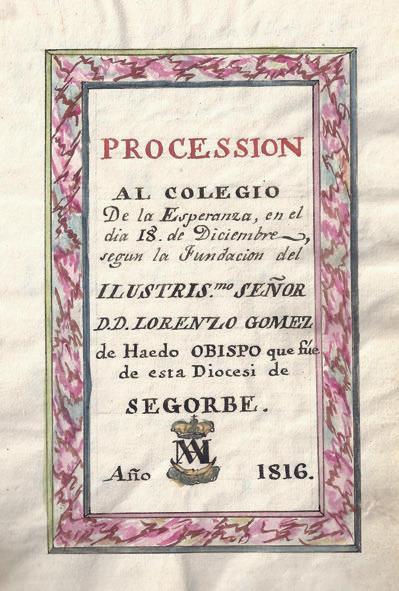 no queda fijado en jueves, sino que será el coincidente con la fecha de la festividad el día 18 de diciembre, y que la romería no es tanto una rogativa como una acción de gracias. De la misma manera que, todo parece indicar, ha dejado de ser una fiesta de patronato municipal y se pasa totalmente al eclesiástico, en concreto, a una fundación episcopal. El ritual de la función litúrgica lo vemos rigurosamente recogido en el libro que ha de usar el Sochantre de la catedral, que dirigirá el ceremonial, copiado en 1816 con el título Procesión al Colegio de la Esperanza, en el día 18 de diciembre, según la fundación del Ilustrísimo Señor don Lorenzo Gómez de Haedo, obispo que fue de esta Diócesis de Segobe.
