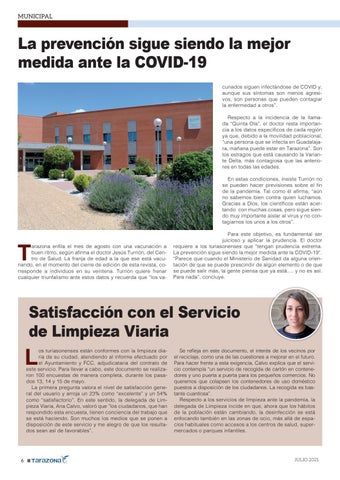 arazona enfila el mes de agosto con una vacunación a buen ritmo, según afirma el doctor Jesús Turrión, del Centro de Salud. La franja de edad a la que ese está vacunando, en el momento del cierre de edición de esta revista, corresponde a individuos en su veintena. Turrión quiere frenar cualquier triunfalismo ante estos datos y recuerda que “los va-