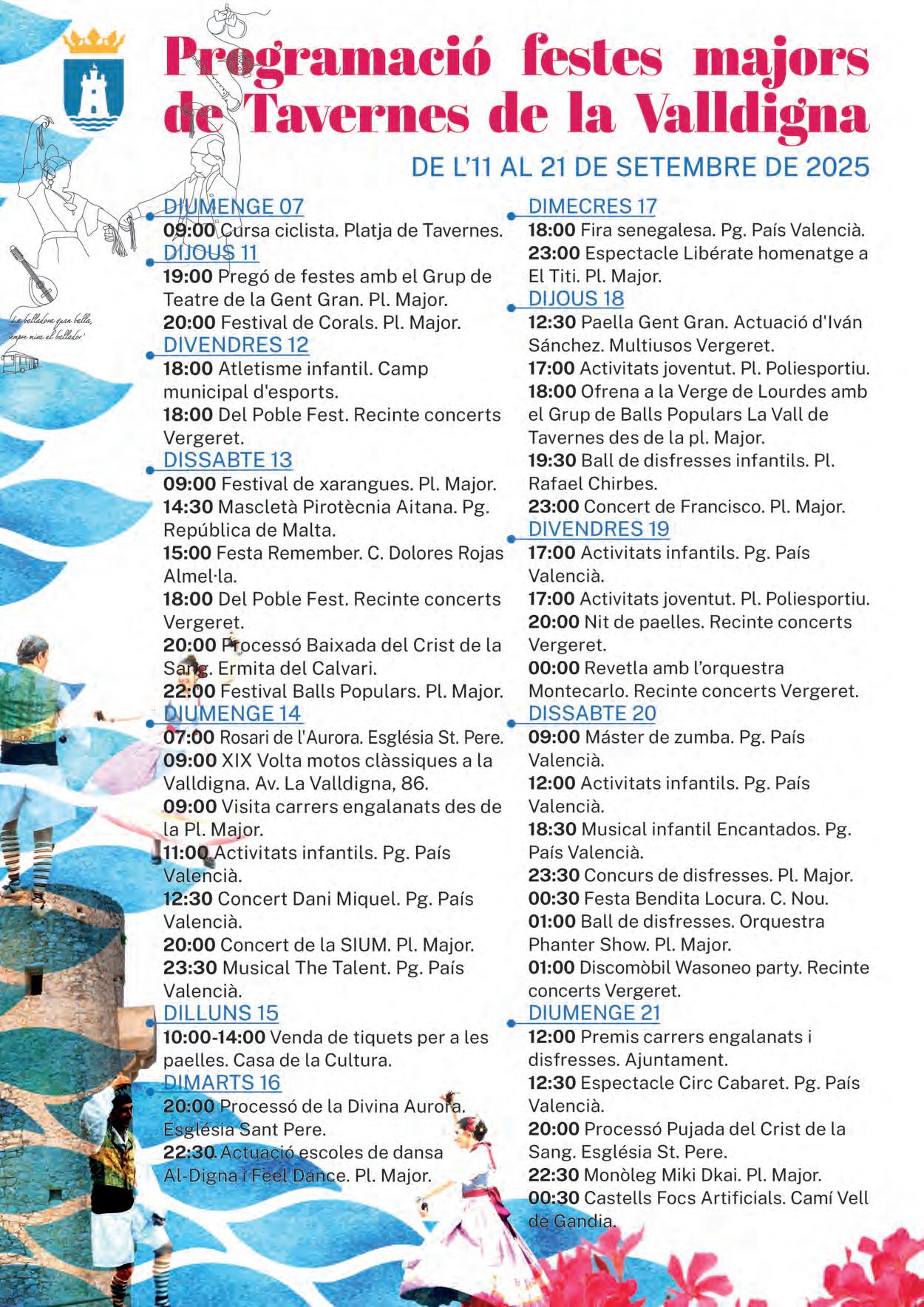 Arriba el moment més esperat de l’any a Tavernes de la Valldigna: les nostres Festes Majors. Un temps per celebrar, compartir i viure intensament tot allò que ens fa únics com a poble. Són dies de retrobaments, de quedar amb amics i amigues, de records que tornen i de moments nous que quedaran per sempre gravats a la memòria.