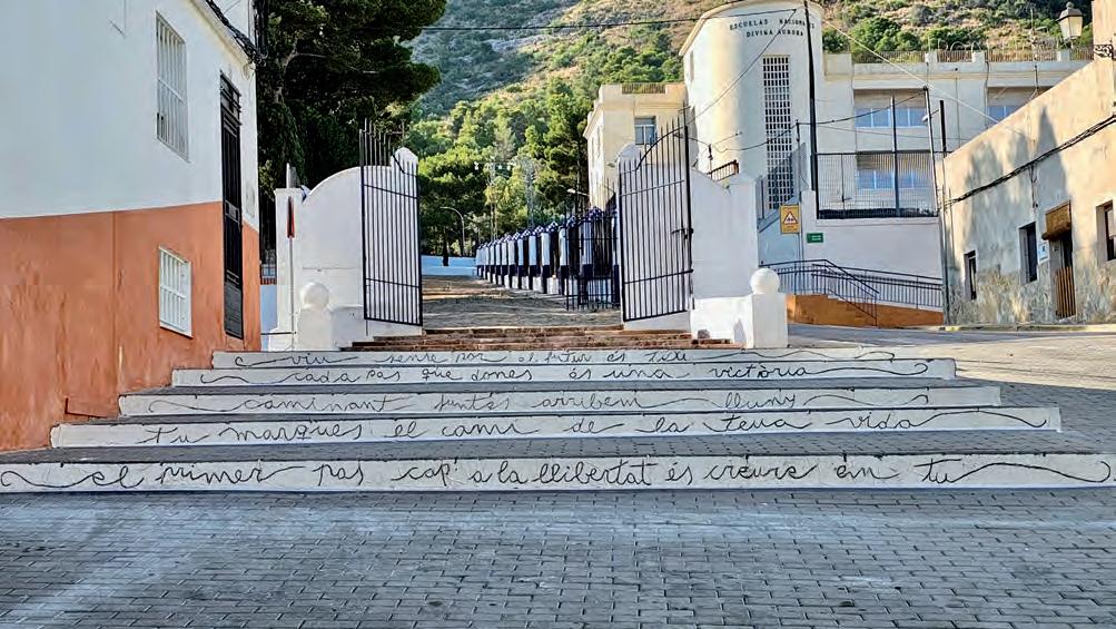 Els escalons pintats, que condueixen cap a la zona més alta del poble, el Calvari. Ací, l’art es fon amb el paisatge, amb les muntanyes al fons com a metàfora d’esperança, força i superació.