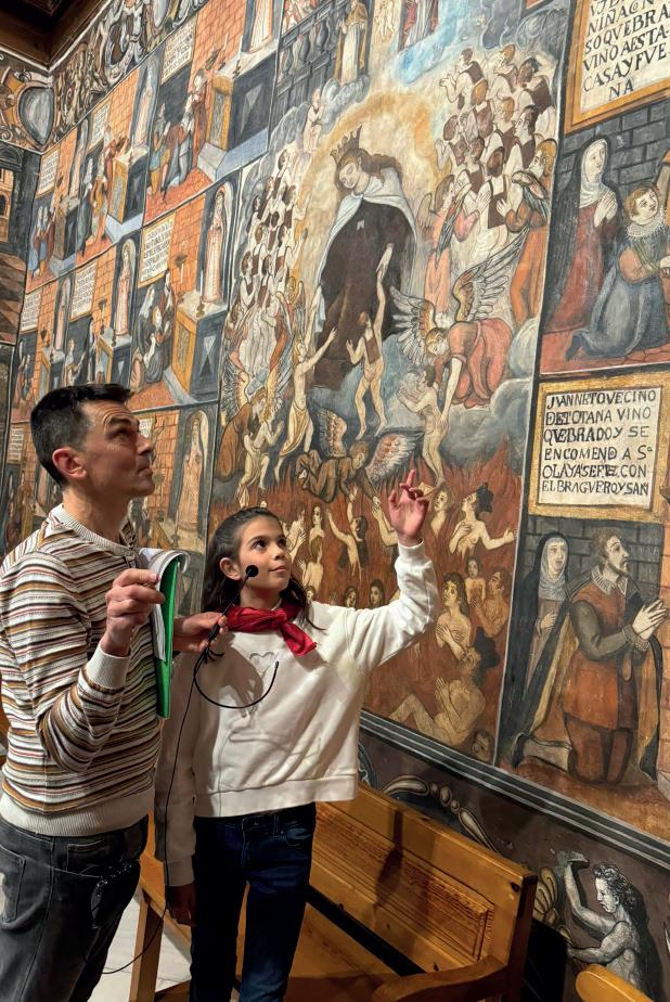 pudieron disfrutar de una jornada de conocimiento de este tesoro artístico explicado por chicos de su misma edad. Se complementó la visita con un taller de dibujo en el que los alumnos tuvieron la oportunidad de elegir entre los distintos “grutescos” que decoran las cenefas que enmarcan las pinturas, dibujándolos y a los que pusieron nombre, así como los escudos que también aparecen en las mismas cenefas, y que representan distintas localidades del antiguo Reino de Murcia.