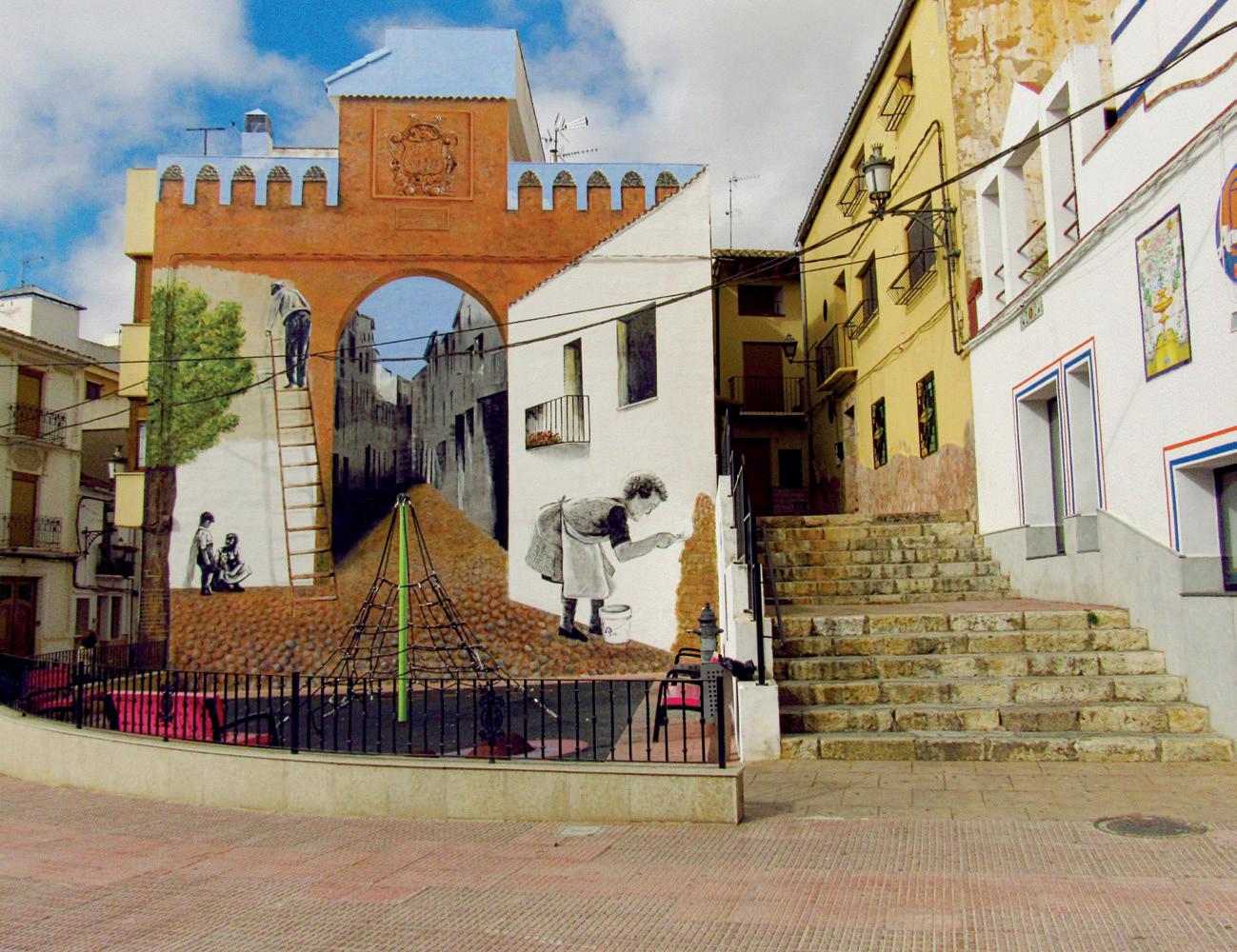 Recreación antigua puerta de la calle Real: ubicado en la C/ Camino, frente al Convento de la Merced. La escena recrea la antigua puerta orientada al este y que daba acceso a la villa de Utiel. Además, se pueden ver diferentes escenas y elementos de la historia local que han querido ser resaltados, como: la muralla y sus almenas; el olmo que se encontraba en esta zona; la mujer representa la labor del enjalbegue; las propias viviendas tradicionales y otros elementos pictóricos que debe descubrir el visitante que lo contemple. Fue realizado por Tamoji en 2018.