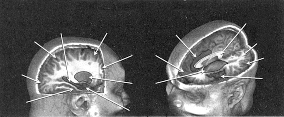 Uno de los haces de filamentos de materia blanca más importantes es el cuerpo calloso. Éste une a los hemisferios izquierdo y derecho del cerebro, separados por una ranura profunda, la cisura longitudinal, que corre en línea recta en medio del cerebro. Aunque cada hemisferio contiene en esencia el mismo conjunto de estructuras neuronales especializadas, tienen diferencias importantes. El izquierdo, por ejemplo, está un poco más involucrado en el lenguaje y el manejo de símbolos, mientras que el derecho tiene predisposición a manejar el procesamiento visuo-espacial y el reconocimiento de rostros, entre otras cosas. El cuerpo calloso salva la distancia entre ambos y permite integrar la información de los Representacióndos. tridimensional del cerebro de Jeff Brown por Mark Fenske. Escaneo de IRM que muestra regiones importantes del cerebro de un triunfador occipitaltemporallóbulolóbulolóbuloparietal frontallóbulo cuerpocallosomateriablancamateriagriscortezainsularcinguladacortezaanterior prefrontalcortezagangliosbasales hipocampo amígdala