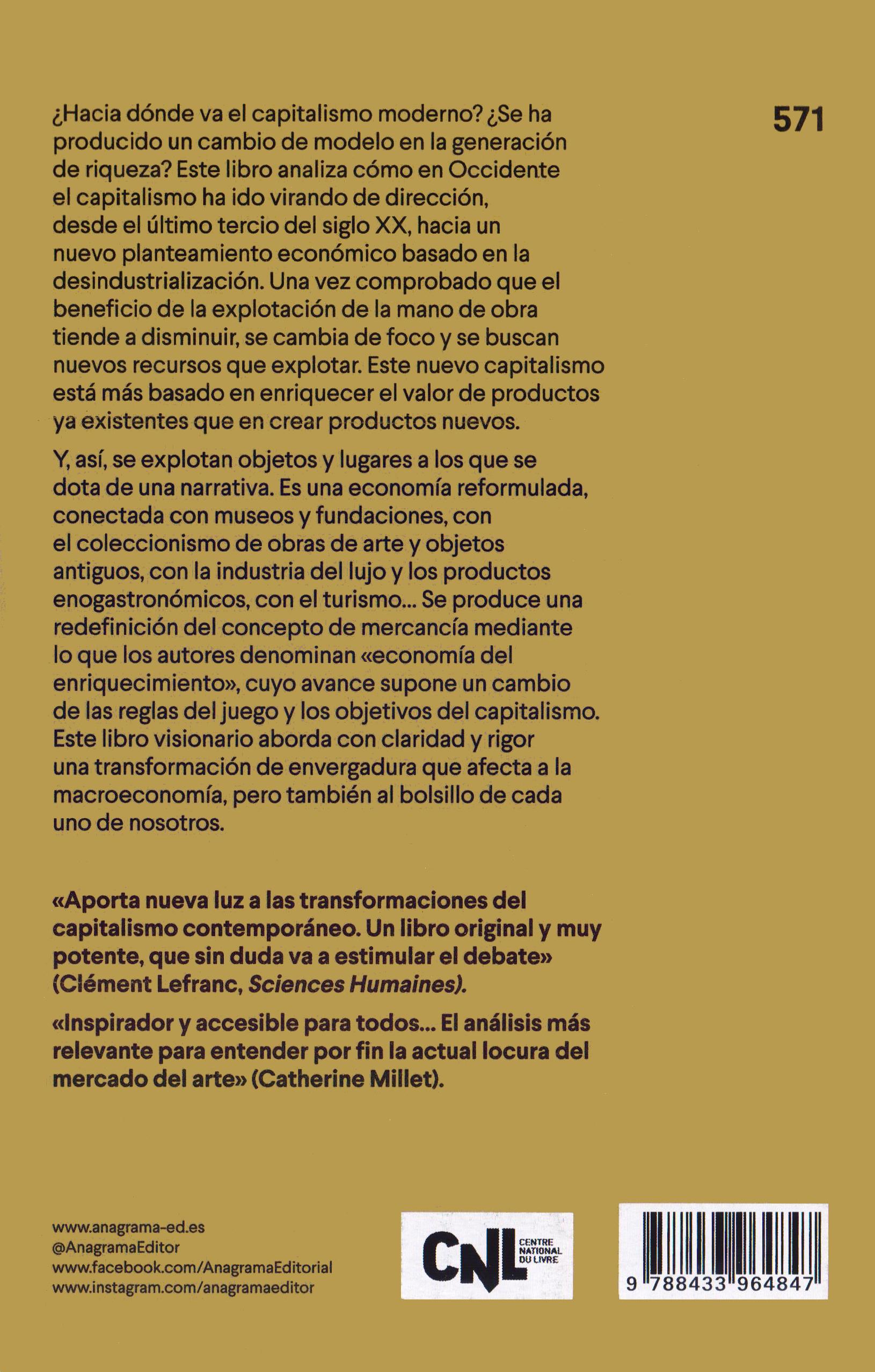 los seres personas y cosas reunidas en un mismo espacio representan una ruptura radical con el pasado, ruptura marcada por la formación del capitalismo industrial y nanciero, y que se concreta en las destrucciones emprendidas por Haussmann y en la reorganización del tejido urbano que las sigue. La época de la «mercancía fetiche» trata de asentar su legitimidad en una esceni cación futurista de los bene cios de la «técnica», y la «con anza ciega en el progreso» es el instrumento mediante el cual «el historiador, que se identi ca con el vencedor», sirve «irremediablemente a quienes poseen el poder en la actualidad» Si trasladamos el personaje del âneur al París del siglo XXI, veremos que está inmerso en una realidad completamente distinta. No es menos capitalista que aquella a la que se enfrentaba el âneur que evocaba Benjamin, pero en ella, sin embargo, el «lujo» ya no presume de ser «industrial» Al contrario, se esfuerza por hacer olvidar su arraigo en una trama productiva, mucho más fácil de escamotear por cuanto está en gran parte deslocalizada en la órbita de otras «ciudades mundo» lejanas. La acumulación capitalista continúa y hasta se acentúa, pero se basa en nuevos dispositivos económicos y se asocia a una diversi cación del universo de la mercancía en función de las modalidades de valorización. El presente libro trata de describir esta transformación, particularmente sensible en los Estados que fueron la cuna del potencial industrial europeo, y más en concreto en Francia, y de analizar la distribución de la mercancía entre distintas formas de valorización. En consecuencia, nuestro trabajo se orienta en dos direcciones que trataremos de articular La primera es más bien de naturaleza histórica. Tiene por objeto un cambio económico que, desde el último cuarto del siglo XX, ha modi cado profundamente la forma en que se crea riqueza en los países de Europa Occidental, marcados, por un lado, por la desindustrialización, y, por el otro, por la creciente explotación de recursos que, sin ser en absoluto nuevos, han cobrado una importancia sin precedentes. A nuestro entender, la magnitud de este cambio solo se advierte cuando se comparan ámbitos que suelen considerarse por separado, como, sobre todo, las artes, en particular las artes plásticas, la cultura, el comercio de objetos antiguos, la creación de fundaciones y museos, la industria del lujo, la patrimonialización o el turismo Trataremos de mostrar que las interacciones constantes entre estos distintos ámbitos permiten comprender la forma en que cada uno de ellos genera un bene cio Nuestro argumento será que tienen en común que se basan en la explotación de un yacimiento que no es otro que el pasado Llamaremos a esta clase de economía «economía del enriquecimiento», jugando con la ambigüedad de la palabra «enriquecimiento»: por una parte, la empleamos en el mismo sentido que se habla del enriquecimiento de un metal, de las condiciones de vida, de un fondo cultural, de una prenda de ropa o de un conjunto de objetos reunidos en una colección, para destacar que esta economía no se basa tanto en la producción de cosas nuevas como en intentar enriquecer cosas que ya existían, sobre todo asociándolas a relatos Por otra parte, la palabra «enriquecimiento» remite a una de las especi cidades de esta economía, que es aprovecharse del comercio de cosas destinadas prioritariamente a los ricos y que constituyen también, para los ricos que comercian con ellas, una fuente de enriquecimiento complementaria Nos parece que prestar atención a esta economía del enriquecimiento y a sus consecuencias es indispensable para captar las transformaciones de la sociedad francesa contemporánea, así como algunas de las tensiones que anidan en ella SUSCRÍBETE ¿Te gustaría recibir nuestro boletín de novedades y estar al día con los eventos que realizamos? Suscríbete a nuestra Newsletter. Email * SUSCRIBIR He leído y acepto las condiciones contenidas en la política de privacidad sobre el tratamiento de mis datos para el envío de la newsletter.