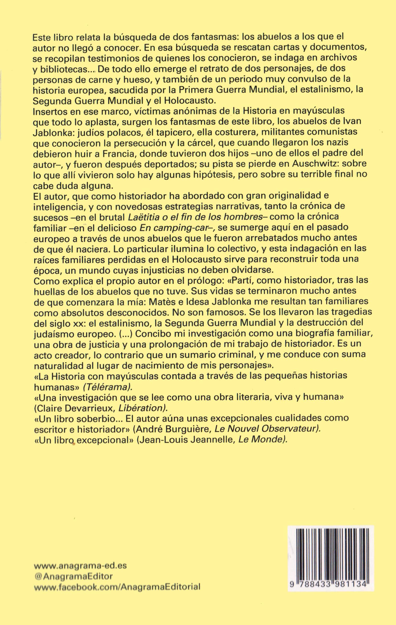 JULES MICHELET, Historia de la Revolución Francesa La escritura es el recuerdo de su muerte y la a rmación de mi vida GEORGES PEREC, W o el recuerdo de la infancia INTRODUCCIÓN Partí, como historiador, tras las huellas de los abuelos que no tuve. Sus vidas se terminaron mucho antes de que comenzara la mía: Matès e Idesa Jablonka me resultan tan familiares como absolutamente desconocidos. No son famosos. Se los llevaron las tragedias del siglo XX: el estalinismo, la Segunda Guerra Mundial, la destrucción del judaísmo europeo No tengo abuelos por el lado paterno: así ha sido siempre Por supuesto que están Constant y Annette, los tutores de mi padre y de mi tía, pero no es lo mismo. También están mis abuelos maternos, que vivieron toda la guerra con una estrella en el pecho En junio de 1981, antes de que yo cumpliera ocho años, les escribí para manifestarles mi amor. Mi letra era grande y torpe. Llena de faltas de ortografía y corazones dibujados al nal de cada frase. Al pie del papel de carta, un elefantito con gorra va en monopatín en medio de una jungla de ores gigantes He aquí lo que escribí: «Podéis estar seguros de que, cuando os muráis, pensaré en vosotros con tristeza, toda mi vida. Aun cuando mi propia vida se acabe, mis hijos os habrán conocido. Incluso los hijos de ellos os conocerán cuando yo esté en la tumba. Para mí, vosotros sois mis dioses, mis dioses adorados que velarán por mí, solo por mí Pensaré: mis dioses me abrigan, da igual que vaya al in erno o al paraíso».