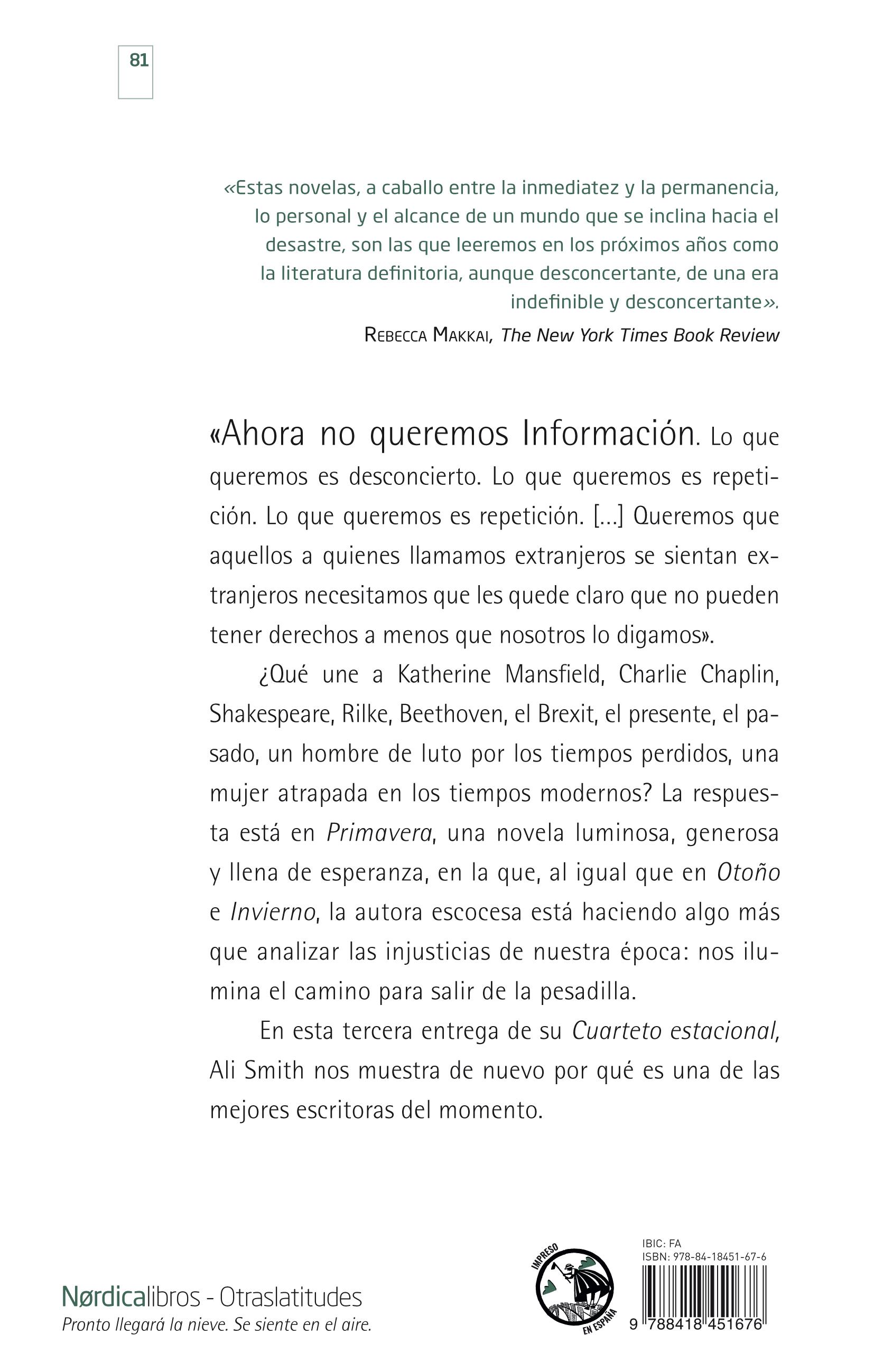 Título original: Spring © Ali Smith, 2019 All rights reserved © De la traducción: Magdalena Palmer © De esta edición: Nórdica Libros, S. L. Avda. de la Aviación, 24, bajo P - CP: 28054 Madrid Tlf: (+34) 917 055 057 - info@nordicalibros.com Primerawww.nordicalibros.comediciónenNórdica Libros: mayo de 2021
