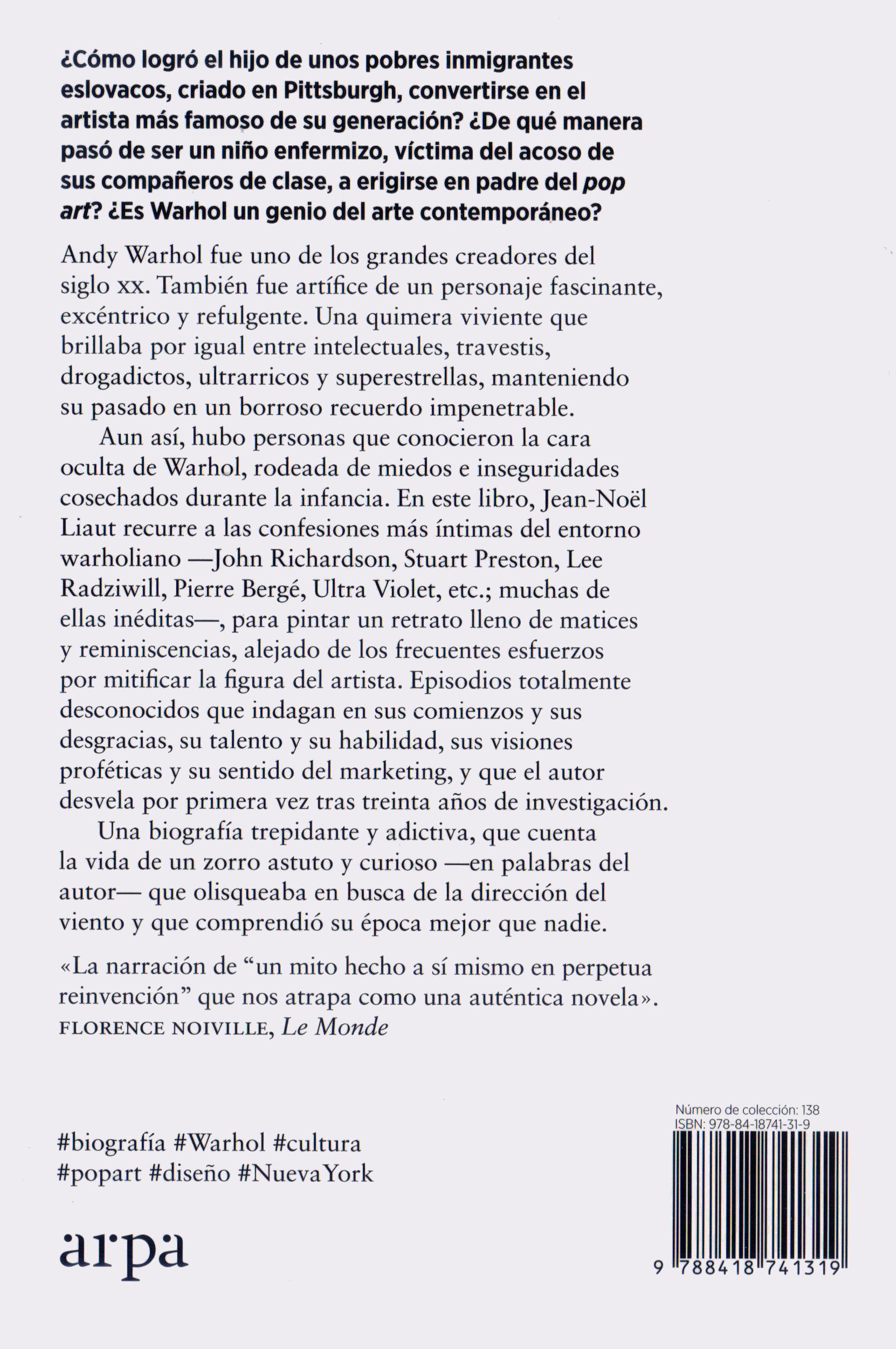 He intentado captar a Warhol de frente, de espaldas, de per l y en semiper l; he procurado descubrir todos los mati ces característicos de su personalidad. En ocasiones ha sido como ponerse un manto de ortigas. Ha habido también momentos llenos de ores. Ante todo me he tomado el tiempo necesario para penetrar en la atmósfera warholiana, para evaluar sus méritos y sus aquezas. Encuentros y lecturas han alimentado el retrato de este hombre orquesta, a un tiempo ilustrador, pintor, fotógrafo, cineasta, autor (a falta de ser auténticamente escritor), creador de revistas y descubridor de talentos. O de cómo el hijo de unos pobres inmigrantes rute