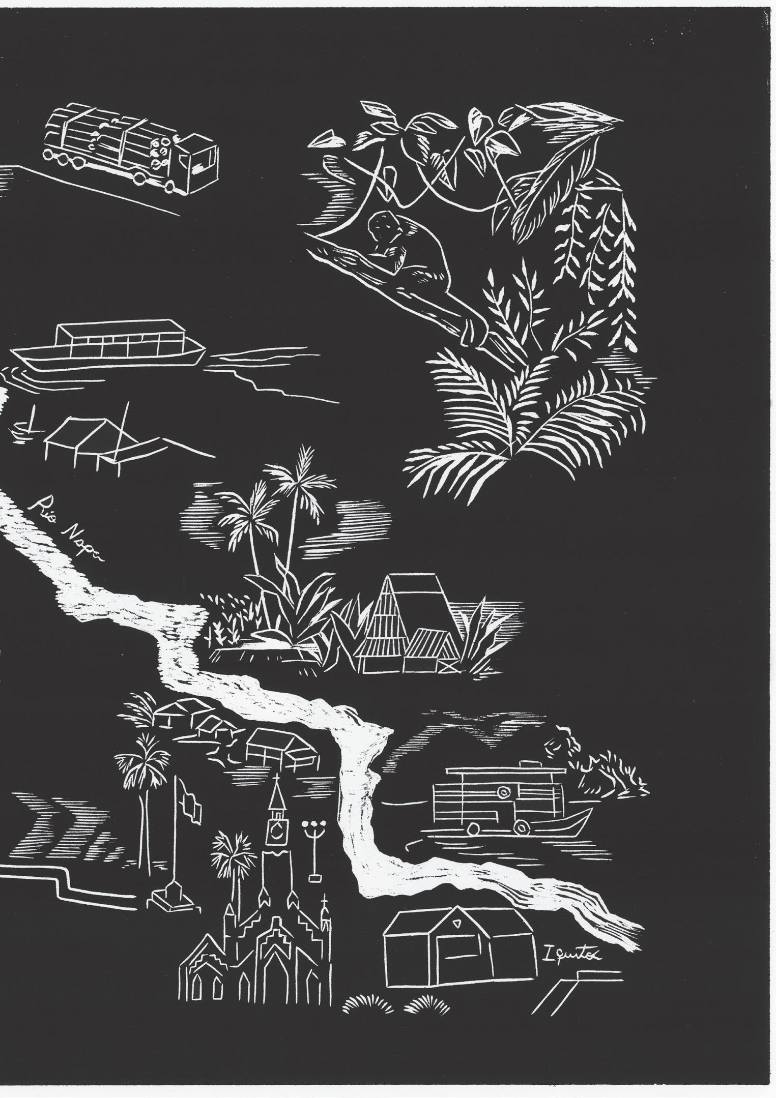 Los cofanes, por su parte, debieron sentir curiosidad ante el derrumbe de la arbolada. Los helicópteros que aterrizaban en sus territorios los desconcertarían; los temblores de la tierra provocados por las explosiones de sondeo los pondrían en guardia. Posiblemente, em pezarían a identificar la irrupción con las invasiones de curas y caucheros de las viejas historias. Para cuando quisieron reaccionar ante la ocupación, el petróleo ya bro taba y sus comunidades estaban cercadas por carreteras, tuberías y plataformas. Llueve tenaz cuando el bus estaciona en un terraplén paralelo a la carretera; media hora de parada. Los en tumecidos pasajeros buscamos refugio bajo el techo de hojas de palma de la venta. Me siento con un cevi chocho en uno de los bancos corridos. Hay wifi y apro vecho para leer sobre Lago Agrio en el celular. Según la Lonely Planet, «la capital de Sucumbíos es tristemente célebre por su peligrosidad y sus pocos encantos. Las agencias de viaje saben de la inseguridad de esta ciudad amazónica y actúan en consecuencia recogiendo casi de inmediato a quien se quiera adentrar en la selva. Lo mejor es evitar pasar tiempo innecesariamente en la ciudad o deambulando más allá de los lugares designa dos para la recogida». Norteamericanos constatando su obraYaexterior.anochece al reanudar la marcha. Tres operarios de pozos petroleros salen de la nada, los monos de trabajo renegridos, y suben a la carrera al bus.