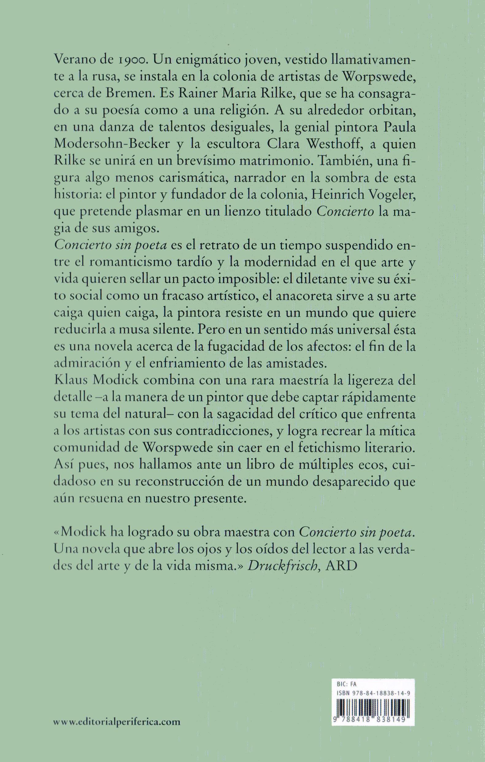 «Concierto sin poeta no sólo pinta hermosos paisajes, sino que ilumina la relación entre el arte y la vida, y ofrece un sin fín de sorpresas histórico-literarias.» Ostthüringer Zeitung «Modick ha logrado su obra maestra con Concierto sin poe ta. Un libro que abre los ojos y los oídos del lector a las verdades del arte y de la vida misma.» Druckfrisch, ARD klaus modick (Oldenburg, Alemania, 1951) es escritor y traductor literario. Tras varias cátedras y estancias en el extranjero, vive de nuevo en su ciudad natal. Ha recibido numerosos galardones por su extensa obra, entre ellos Pre mio Bettina von Arnim. Estuvo becado en Villa Massimo y en Villa Aurora.
