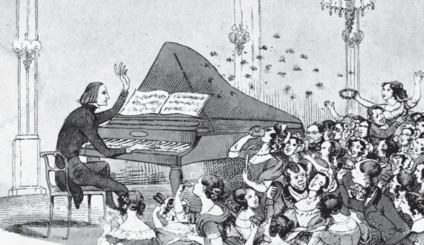 Una viñeta berlinesa en la que aparece Liszt en su momento de esplendor; las mujeres entraban en éxtasis y le lanzaban joyas al escenario.