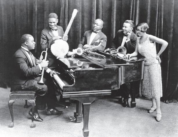 Pero el jazz no surgió de una única fuente; incluso en sus fases iniciales, era una mezcla de influencias negras y blancas, de elemen tos tensos y sentimentales, de las formas clásicas europeas y un bu llicioso griterío. Las tradiciones afroamericanas se combinaron con las que habían importado los nuevos inmigrantes europeos, junto a bailes populares y simples cancioncillas, forjando así un arte híbri do y lleno de ritmos contagiosos y palpitantes y de melodías desga rradoras. En su versión pianística, se introdujo en los salones bajo la forma del ragtime, que combinaba el conocido estilo de las marchas y los valses sentimentales con unos ritmos nuevos y extraños que alteraban la cadencia habitual de la música colocando acentos en lugares “equivocados”. El resultado fue un estilo rebosante de brincos y traspiés que le daban un toque humorístico. A medida que fue evolucionando, este arte popular incorporó diversos elementos del blues, realzó su vitalidad rítmica y dio lugar el boogie-woogie y al swing. Los Louis Armstrong’s Hot Five, con Lil Hardin.
