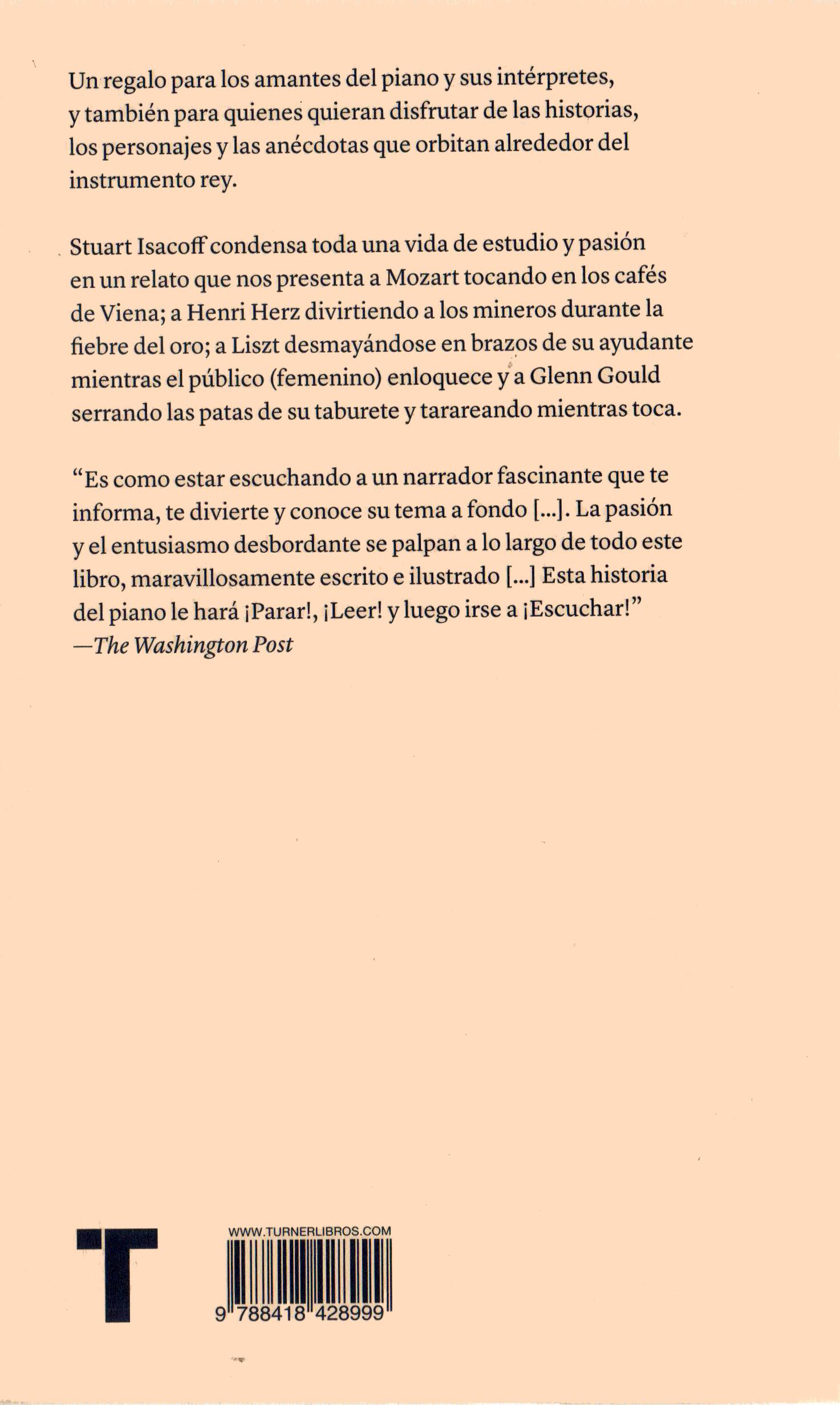 Es una posición de la que el piano ha disfrutado durante más de trescientos años. Atraía a los amantes de la música a los salones parisienses para escuchar las dolientes improvisaciones de Chopin, y a las salas de conciertos vienesas para oír los feroces arrebatos de Beethoven, que hacían chasquear las cuerdas. El piano fue pro tagonista de las fiestas que la gente organizaba en Harlem para con seguir algo de dinero con que pagar el alquiler, donde los pianistas competían encarnizadamente, y sirvió para consolar a los solitarios mineros de la fiebre del oro en California, cuando Henri Herz, el errante virtuoso procedente de Europa, interpretaba para ellos variaciones de “Oh Susanna”. También reconfortó a miles de campe sinos siberianos que nunca habían oído una nota de música clásica hasta que el maestro ruso Sviatoslav Richter la llevó a sus casas. Y todavía es capaz de hacer enloquecer a las masas de todo el mundo en salas de conciertos, clubes y estadios.