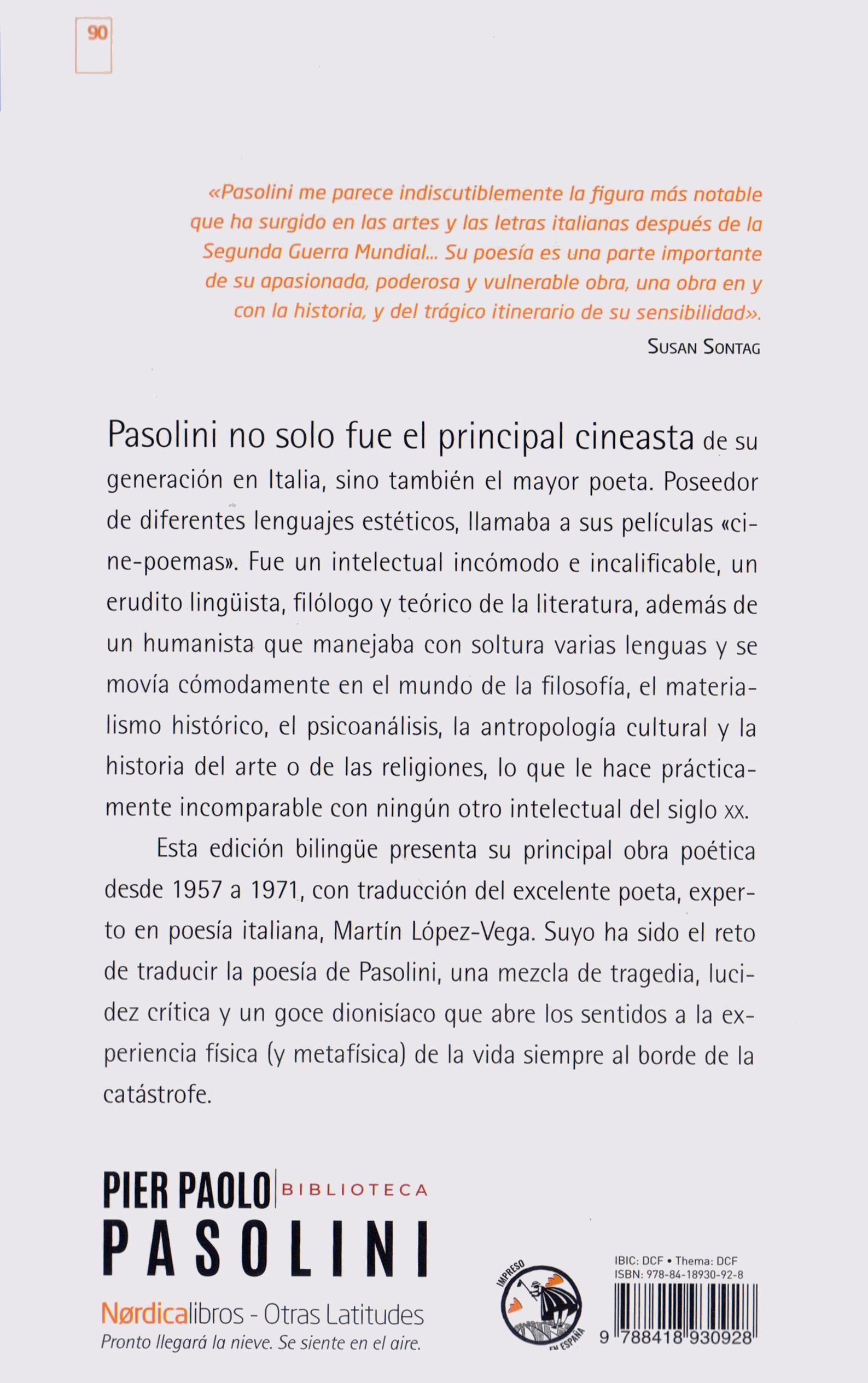 © Le ceneri di Gramsci, 1957 Aldo Garzanti Editore; La religione del mio tempo, 1961 Aldo Garzanti Editore; Poesia in forma di rosa, 1964 Aldo Garzanti Editore; Trasumanar e organizzar, 1971 Aldo Garzanti Editore © De la traducción: Martín López-Vega © De esta edición: Nórdica Libros, S.L. Doctor Blanco Soler 26 - CP: 28044 Madrid Tlf: (+34) 917 055 057 - info@nordicalibros.com Primerawww.nordicalibros.comediciónenNórdica Libros: febrero de 2015 Segunda edición: marzo de 2022 ISBN: ImpresoThema:IBIC:Depósito978-84-18930-92-8Legal:M-6726-2022DCFDCFenEspaña/Printedin Spain Imprenta Kadmos (Salamanca) Diseño de colección: Filo Estudio e Ignacio Caballero Maquetación: Diego Moreno Corrección ortotipográfica: Ana Patrón y Susana CualquierRodríguezformade reproducción, distribución, comunicación pública o transformación de esta obra solo puede ser reali zada con la autorización de sus titulares, salvo excepción pre vista por la ley. Diríjase a CEDRO (Centro Español de Derechos Reprográficos, www.cedro.org) si necesita fotocopiar o escanear algún fragmento de esta obra.