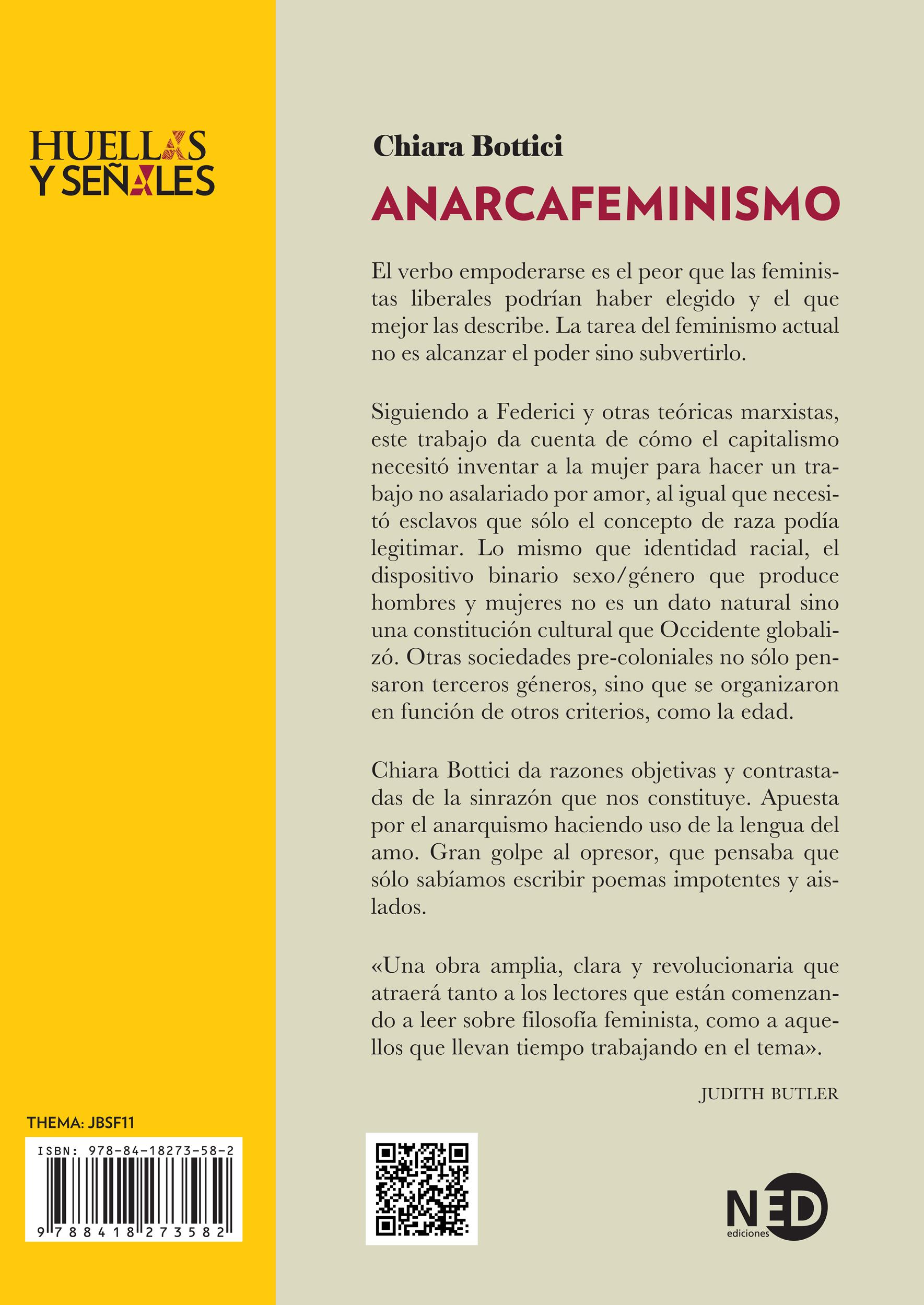 Anarcafeminismo de Chiara Bottici es, en este sentido, un freno de emergencia irremplazable, quizás el único capaz de hacernos comprender que la tarea del feminismo actual no es alcanzar el poder sino subvertirlo. ¿Y porqué habría que subvertir nada preguntaréis— si ya somos todas ciudadanas de pleno derecho, si hasta una mujer negra ha sido nombrada vicepresidenta, si hoy una mujer transgénero puede llegar a ocupar un cargo de subsecre taria? El poder se viste de seda, pero no olviden lo que esconde en su Ministerio del «interior». Que una serie de Netflix sea protago nizada por familias gays, parejas poliamorosas o por estupendí simas transgénero, sólo da cuenta de la relajación moral de una estructura de dominación que ya no necesita recurrir a la vieja moralina cristiana para mantener su soberanía. El capital y el Estado ya no requieren de la moral protestante, como Weber pretendió. Lo que sí necesitan son mujeres, segundo sexo y dispositivo sexo/género. Esto es lo que este libro de Bottici sabe explicar muy bien. Siguiendo a Federici y otras teóricas marxistas, este trabajo da cuenta de cómo el capitalismo necesitó de la invención de la mujer. El dispositivo binario sexo/género, el hecho de que haya hombres y mujeres, no es un dato natural sino una construc ción cultural que Occidente ha exportado a escala global. Otras sociedades precoloniales no sólo pensaron terceros géneros, géneros oníricos y fluctuantes, «dos espíritus», sino que se organi zaron en función de otros criterios como la edad. Fue la coloniza ción la que impuso la construcción binaria, fue el capitalismo el que concibió la mujer tal y como hoy la conocemos. También así, el colonialismo inventó la raza, y lo hizo por la misma razón. El capitalismo necesitó expropiar el trabajo de las mujeres y hacerlo pasar por cuidados, necesitó por mor de su supervivencia la exis tencia de un trabajo no asalariado que se hacía por amor, al igual