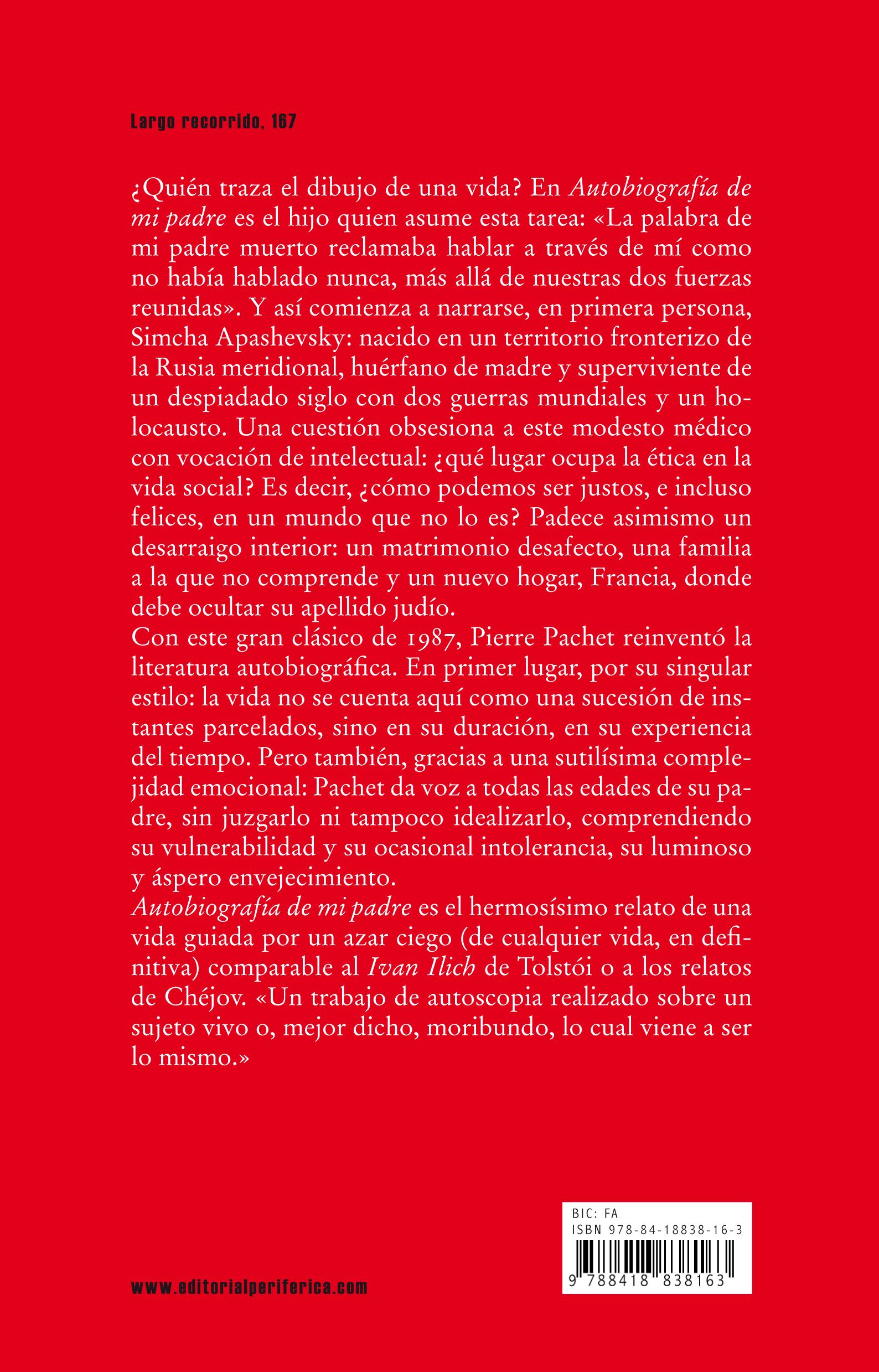 Comencé aquella búsqueda justo por donde mi padre me había enseñado: volviéndome hacia mi vida interior . Ahí estaba el instrumento, era lo que heredaba de él, además de algunos libros que siempre le había envidiado. ¿Qué encontraba yo en aquella vida interior cuando pensaba en mi padre? Precisamente lo que he expresado en esta Autobiografía : una palabra que se escribía, se retomaba, que no iba dirigida a nadie, sino en busca de cierta manera de expresarse, de una verdad que se le escapaba. La muerte de mi padre no había estrangulado su palabra y tampoco le permitía subsistir tal cual era en mi palabra y en mis oídos, pues se encontraba ya sometida a una tarea nueva y desmesurada: la de contar su vida de principio a fin, la de engendrarse en una soledad absoluta, la de asumir la responsabilidad entera de su existencia.
