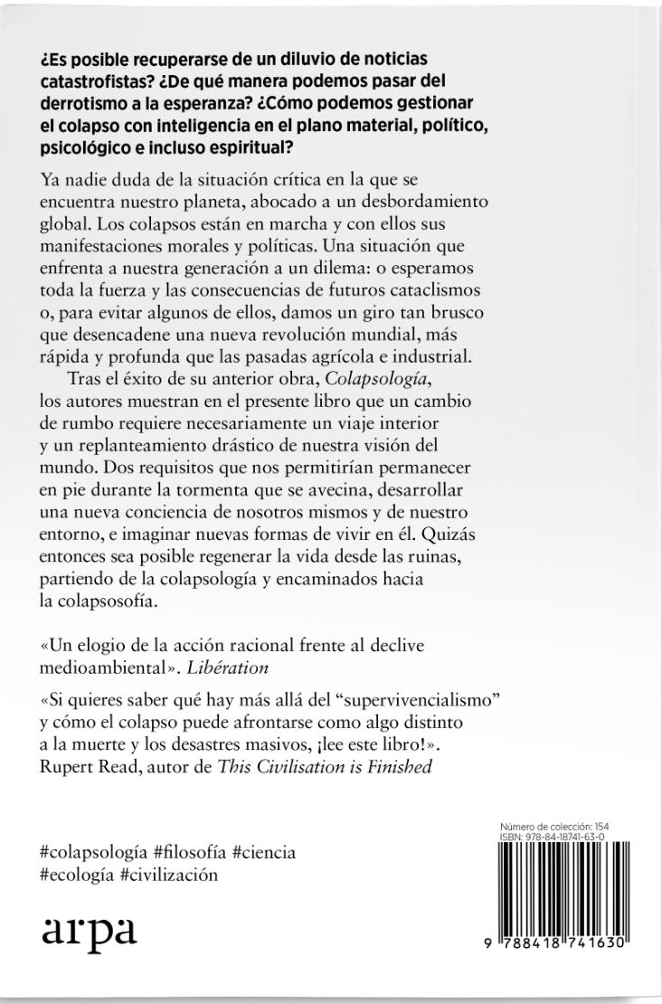 De ahí justamente la importancia de este libro de Pablo Servigne, Raphaël Stevens y Gauthier Chapelle. La esta industrial pronto habrá terminado. Numerosos desafíos vitales, de diferente orden, volverán a ocupar el escenario. El n de este mundo, y más aún los mundos que surgirán de él, dependerán estrechamente de los vínculos que consigamos establecer y del imaginario que logremos inventar para el futuro más próximo. De modo que este libro es muy valioso, en este sentido. No es un tratado de colapsología, sino de colapsosofía. No tiene por nalidad convencernos de un probable colapso —tal ejercicio ya se ha cumplido—, sino de prepararnos interiormente para afrontarlo, y en cierto modo para