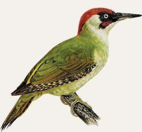 El pájaro carpintero verde «tamborilea» muy de vez en cuando, por lo general cuando excava los agujeros de los nidos, pero aun así deja oír con frecuencia una «risa» aguda, lejana, ligeramente maníaca y burlona.