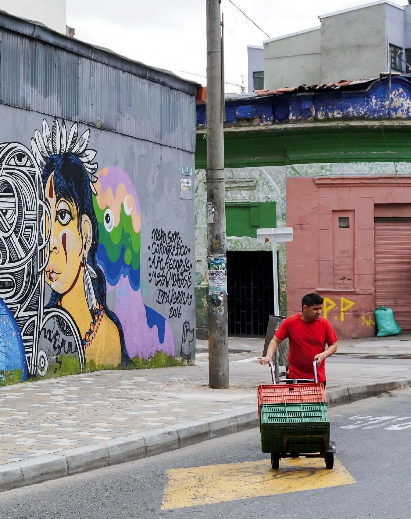 En la capital colombiana, más allá de los tradicionales sitios de interés, se encontrará con el street art, una expre sión artística en constante movimiento. Logrará una visión peculiar del color, la magia y la mística de este país sudame ricano, a través de un proyecto inspirado en el crisol cultural, que permite hacer una lectura de sus muros.
