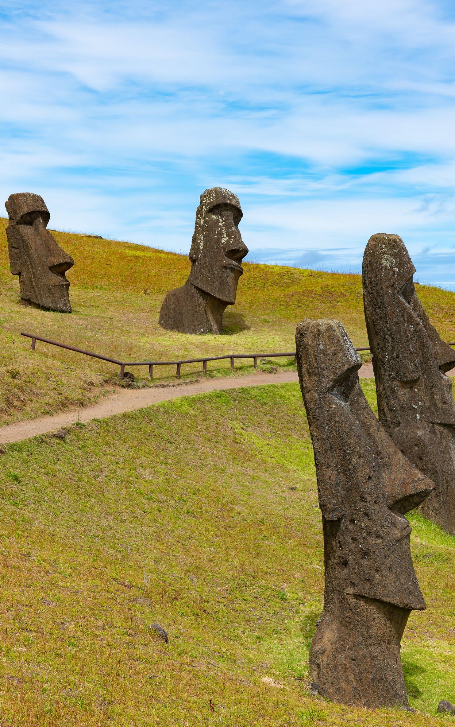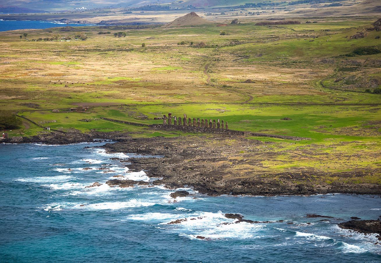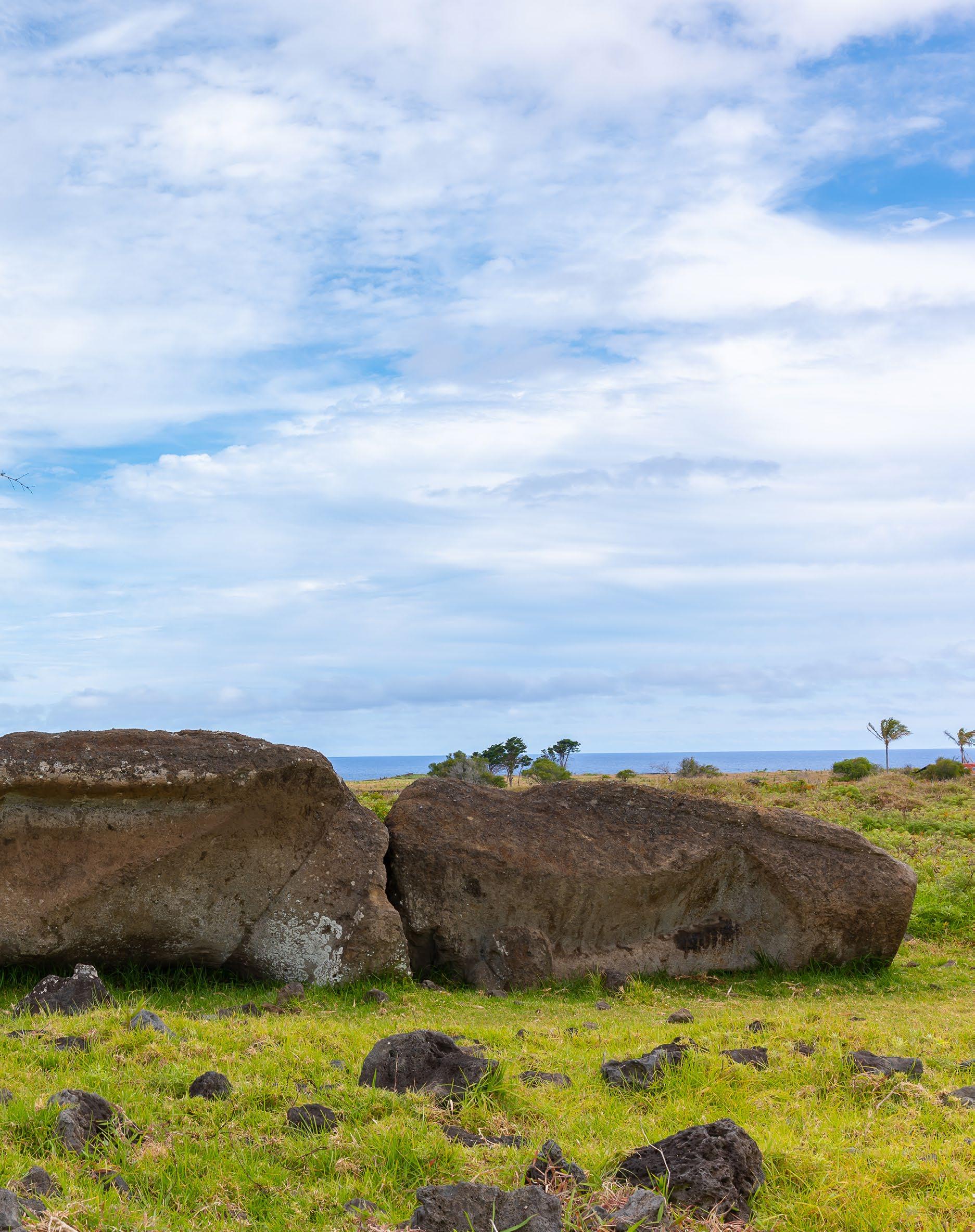 Desde la cantera madre, los moái se alinean con el horizonte en una escena de armonía absoluta.
