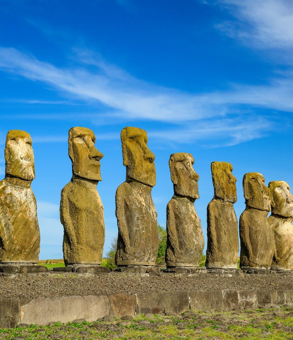 Símbolos de linaje y poder, quince guardianes pétreos desafían el tiempo, custodios del misterio y la identidad rapanui.