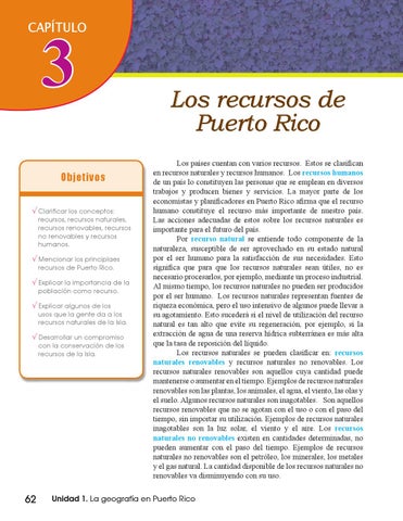 Los recursos de Puerto Rico Los países cuentan con varios recursos. Estos se clasifican en recursos naturales y recursos humanos. Los recursos humanos de un país lo constituyen las personas que se emplean en diversos trabajos y producen bienes y servicios. La mayor parte de los economistas y planificadores en Puerto Rico afirma que el recurso humano constituye el recurso más importante de nuestro país. Las acciones adecuadas de estos sobre los recursos naturales es importante para el futuro del país. Por recurso natural se entiende todo componente de la naturaleza, susceptible de ser aprovechado en su estado natural por el ser humano para la satisfacción de sus necesidades. Esto significa que para que los recursos naturales sean útiles, no es necesario procesarlos, por ejemplo, mediante un proceso industrial. Al mismo tiempo, los recursos naturales no pueden ser producidos por el ser humano. Los recursos naturales representan fuentes de riqueza económica, pero el uso intensivo de algunos puede llevar a su agotamiento. Esto sucederá si el nivel de utilización del recurso natural es tan alto que evite su regeneración, por ejemplo, si la extracción de agua de una reserva hídrica subterránea es más alta que la tasa de reposición del líquido. Los recursos naturales se pueden clasificar en: recursos naturales renovables y recursos naturales no renovables. Los recursos naturales renovables son aquellos cuya cantidad puede mantenerse o aumentar en el tiempo. Ejemplos de recursos naturales renovables son las plantas, los animales, el agua, el viento, las olas y el suelo. Algunos recursos naturales son inagotables. Son aquellos recursos renovables que no se agotan con el uso o con el paso del tiempo, sin importar su utilización. Ejemplos de recursos naturales inagotables son la luz solar, el viento y el aire. Los recursos naturales no renovables existen en cantidades determinadas, no pueden aumentar con el paso del tiempo. Ejemplos de recursos naturales no renovables son el petróleo, los minerales, los metales y el gas natural. La cantidad disponible de los recursos naturales no renovables va disminuyendo con su uso.