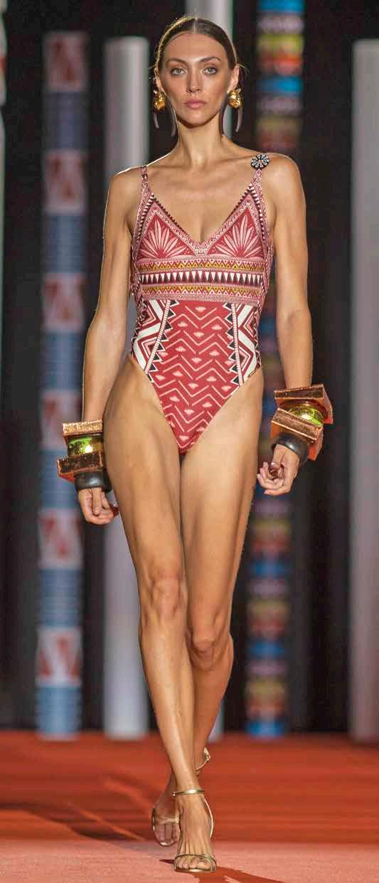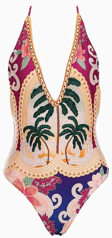 Los trajes de baño de la temporada son una invitación a viajar a destinos paradisiacos; sus estampados se iluminan con tonos impactantes y patrones complejos, mezclando desde palmeras y motivos florales hasta elementos marinos y cenefas geométricas. Estos elementos son ensamblados en un patrón tipo mascada con despliegue simétrico, que se ajusta a cada pieza. Sobre su corte, los bañadores de una pieza se distinguen por su pronunciado escote en V y apertura de pierna alta, siendo ideales para realzar la silueta.