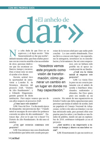o cabe duda de que Dios no se sonas de la tercera edad pero que nadie pudo equivoca, y al dejar escrito: “Más concluir. La casa estaba abandonada, Dios bienaventurado es dar que recibir”, me lleva a conocer este lugar y sin esperarlo, definitivamente sabía, que iban a haber persome la entregaron, invertimos en su remodenas con un corazón sensible a las necesidades lación y la levantamos; fue así como empezade otros, personas dadivomos, esto no hubiera sido “Nosotros vemos sas que sin escatimar esposible sin el apoyo infuerzos, tiempo y recursos, de mi familia. este proyecto como condicional iban a tomar muy en serio ¿Cuál era la visión visión de transfor- inicial al empezar este el ayudar a los demás. Revista actitud tuvo mación; cómo ge- proyecto? la oportunidad de entreLM: La visión Dios vistar a Lourdes R. de nerar un cambio en la puso en mi corazón junMorataya, directora del con el anhelo de un lugar en donde no tamente proyecto DAR, “Distrito ayudar a huérfanos abande Alto Rendimiento”, y hay capacitación.” donados, maltratados y a Eduardo Magermans, abusados, fue Dios quien gerente general de dicha puso esa semilla en mi institución. Pero mejor veamos que nos dicorazón. Me enteré de una organización en cen ellos respecto al proyector DAR. Estados Unidos que daba capacitaciones para ¿Cómo nace este nombre? personas que tienen el anhelo de ayudar, metí LM: Nace de Dios. Un día siendo época mi papelería al Consejo Nacional de Adopde olimpiadas, una persona me dijo: “Cuando ciones, ya llevo dos años en trámites y no me usted se encargue de esos niños los podemos han autorizado nada, pero prometí abrir esas convertir en niños de alto rendimiento”. Enpuertas para los niños y mi familia es una fatonces dije: ¡Eso es lo que voy a hacer! Un milia de palabra, siendo así que en septiemDistrito de Alto Rendimiento, de ahí nace el bre de 2010, estábamos trabajando ya en el nombre. proyecto. ¿Con qué recursos comienza este ¿Qué motiva a un empresario a inproyecto? vertir su tiempo y dinero en una labor soLM: Encontramos una casa abandonada cial? en Retalhuleu que había sido creada para perLM: Honestamente lo que me motiva es