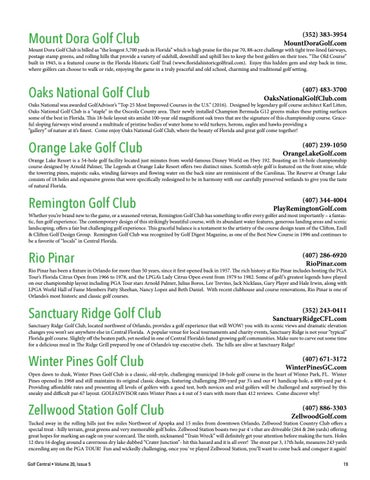 Tucked away in the rolling hills just five miles Northwest of Apopka and 15 miles from downtown Orlando, Zellwood Station Country Club offers a special treat - hilly terrain, great greens and very memorable golf holes. Zellwood Station boasts two par 4`s that are driveable (264 & 266 yards) offering great hopes for marking an eagle on your scorecard. The ninth, nicknamed “Train Wreck” will definitely get your attention before making the turn. Holes 12 thru 16 dogleg around a cavernous dry lake dubbed “Crater Junction”- hit this hazard and it is all over! The stout par 3, 17th hole, measures 243 yards exceeding any on the PGA TOUR! Fun and wickedly challenging, once you`ve played Zellwood Station, you’ll want to come back and conquer it again! Golf Central • Volume 20, Issue 5